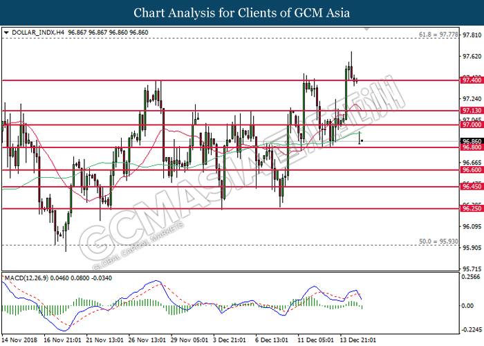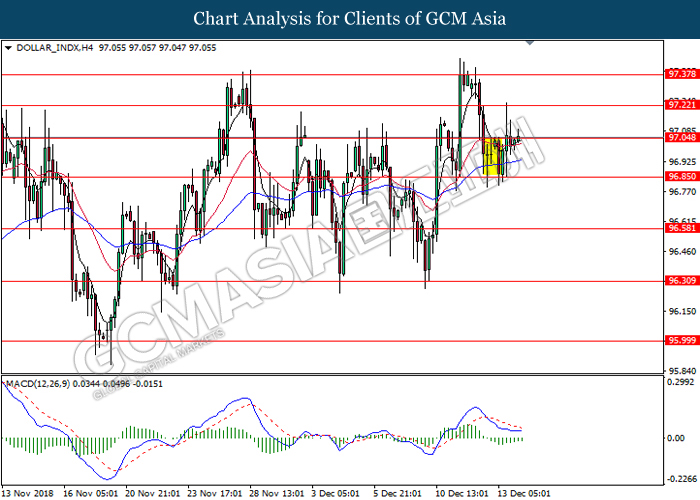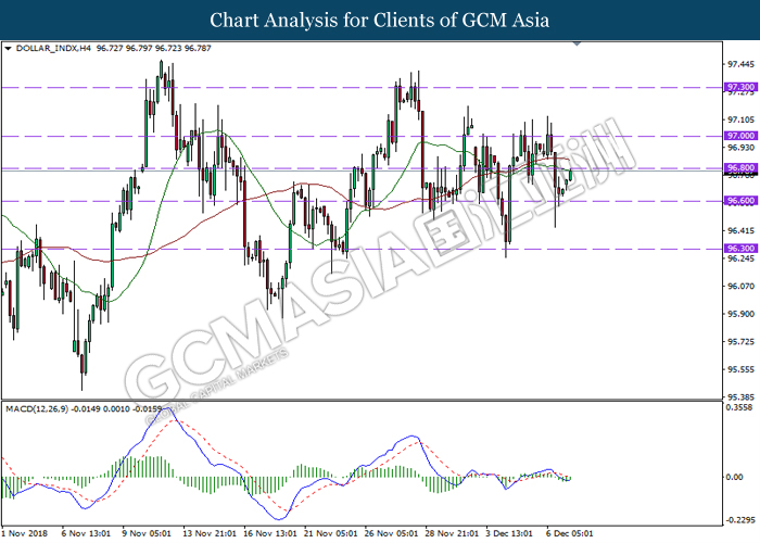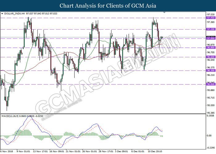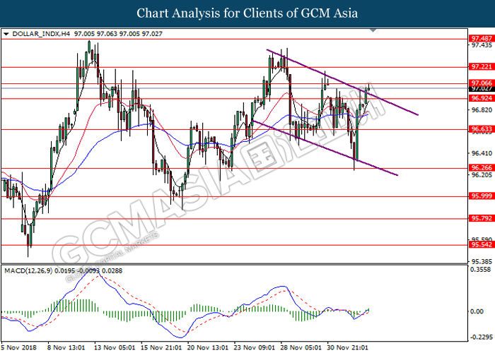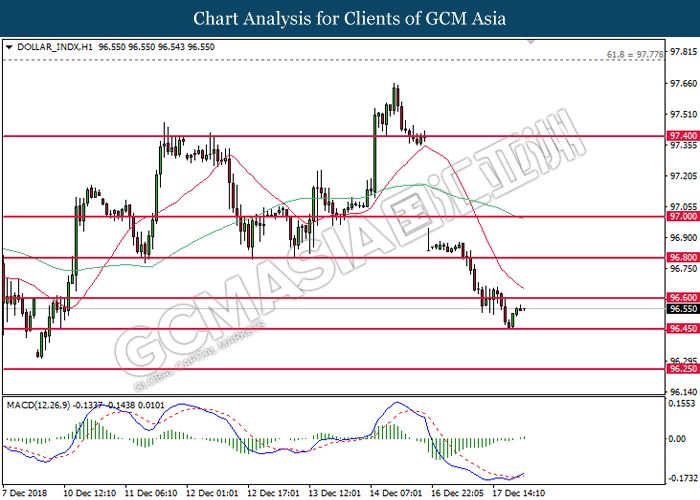 DOLLAR_INDX, H1: Dollar index was traded higher following prior rebound near 96.60. MACD which illustrate diminishing downward momentum suggests the index to extend its gains, towards the direction of 96.80.