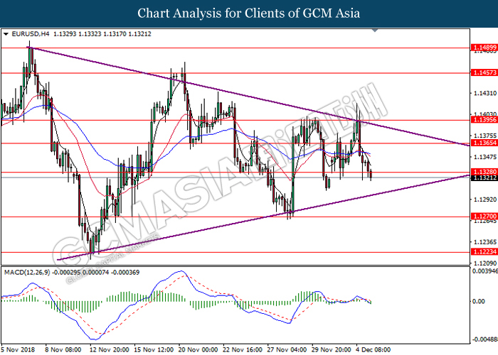 EURUSD, H4: EURUSD was traded lower in a symmetrical triangle while currently testing near the support level at 1.1330. MACD which illustrate bearish momentum and the formation of death cross suggest the pair to extend its losses after successfully closing below the support level at 1.1330.