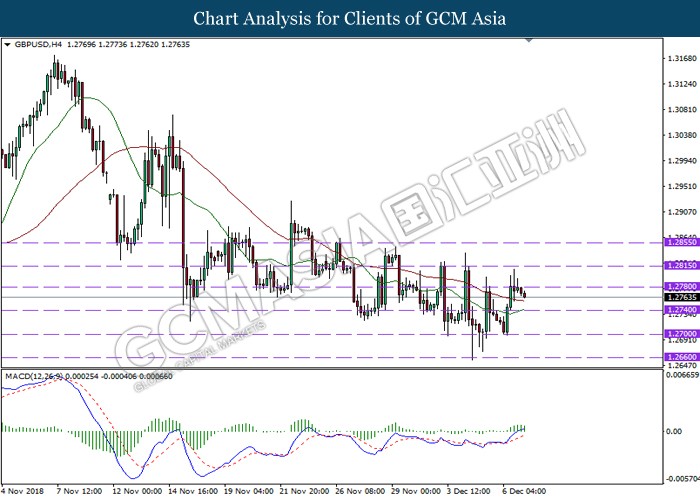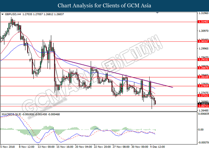 GBPUSD, H1: GBPUSD was traded lower following prior retracement from the upper levels. MACD which has formed a bearish signal suggest the pair to extend its losses, towards the direction of 1.2690.