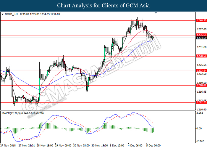 GOLD_, H1: Gold was traded lower following prior breakout from the previous support level at 1235.65. MACD which illustrate bearish bias momentum suggest the commodity to extend its losses toward the support level at 1228.50.