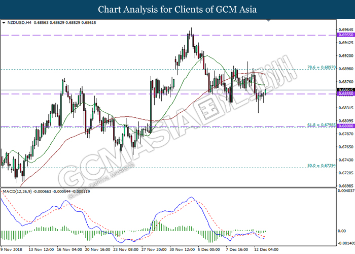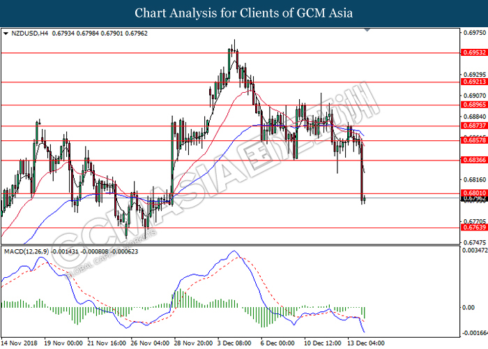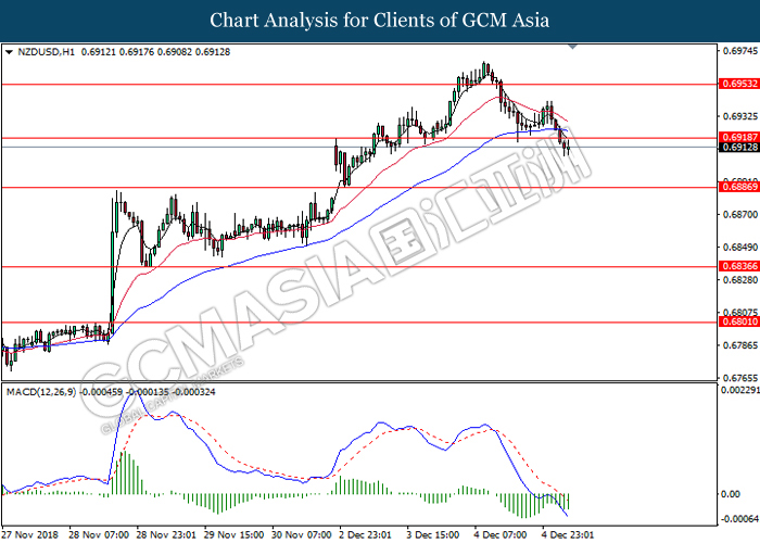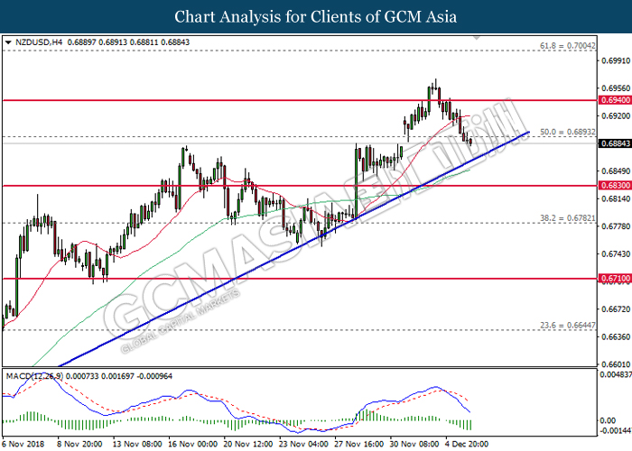 NZDUSD, H4: NZDUSD was traded lower following prior closure below 0.6890. MACD which illustrate persistent downward signal suggests the pair to be traded lower, towards the direction of upward trendline.