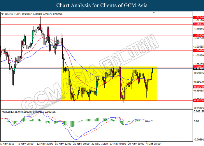 USDCHF, H4: USDCHF was traded higher in sideway channel following prior rebound from the support level at 0.9955. Due to lack of signal from MACD, a retracement from or breakout above the resistance level is required to attain further confirmation before entering the market.