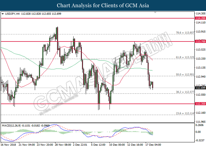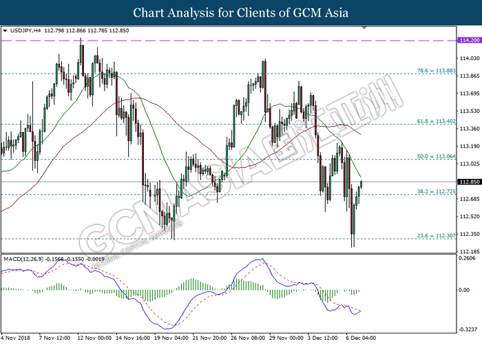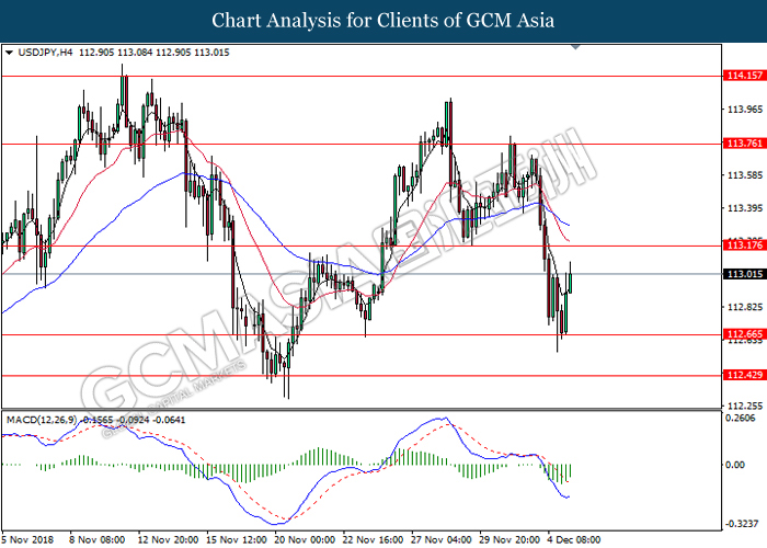 USDJPY, H1: USDJPY was traded lower following prior retracement near the moving average line. MACD which begins to form a bearish signal suggests the pair to extend its losses, towards the direction of 112.60.