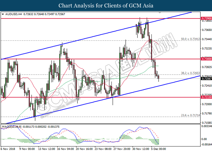 AUDUSD, H4: AUDUSD was traded lower following prior closure below 0.7265. MACD which illustrate bearish signal suggest the pair to extend its losses after breaking the bottom level of upward channel.