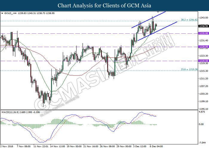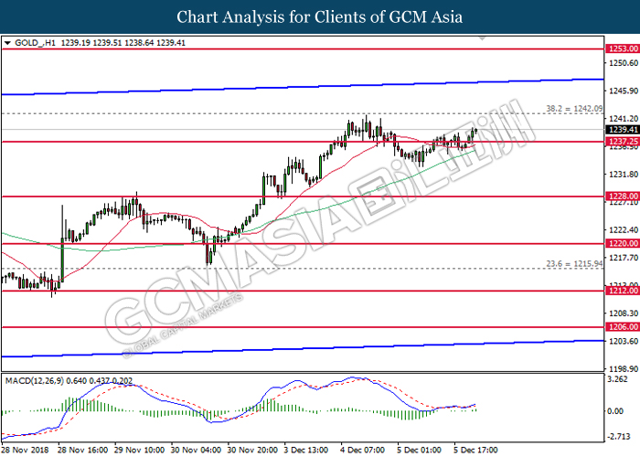 GOLD_, H1: Gold price extended gains following prior rebound and closure above 1237.25. MACD which illustrate persistent upward signal and momentum suggests its price to advance further up and retest near 1242.10.