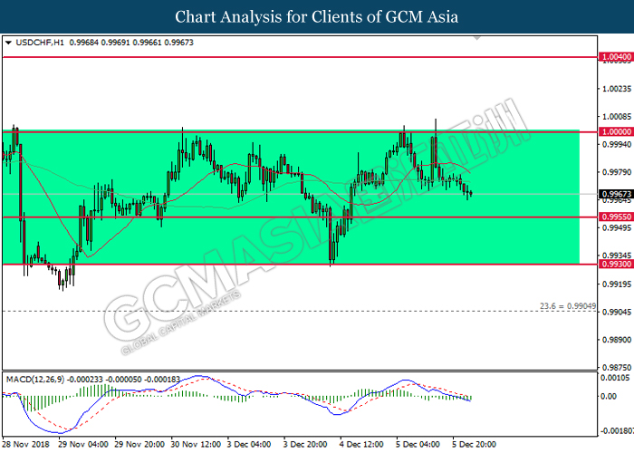 USDCHF, H1: USDCHF remains traded within a sideways channel following prior retracement from the top level. MACD which illustrate bearish signal suggests the pair to be traded lower in short-term, towards the direction at 0.9955.