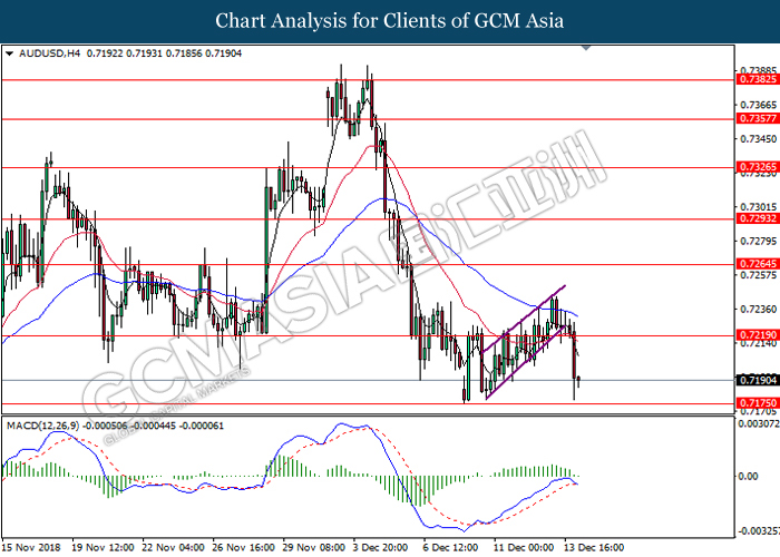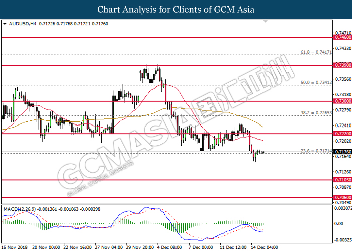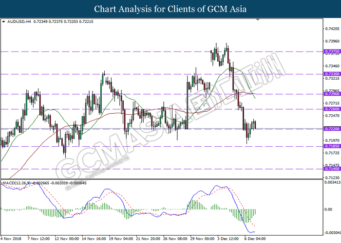 AUDUSD, H4: AUDUSD was traded lower while currently testing the support level 0.7220. MACD which illustrate diminishing bullish momentum suggest the pair to extend its losses after a breakout below the support level.