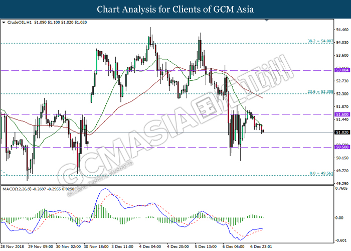 CrudeOIL, H1: Crude oil price was traded lower following prior retracement from the resistance level 51.60. MACD which illustrate diminished bullish momentum suggest the commodity to extend its retracement towards the support level 50.50.