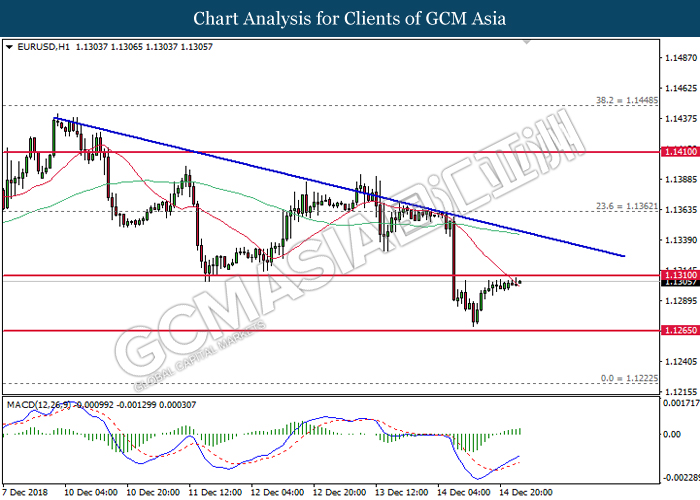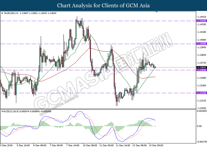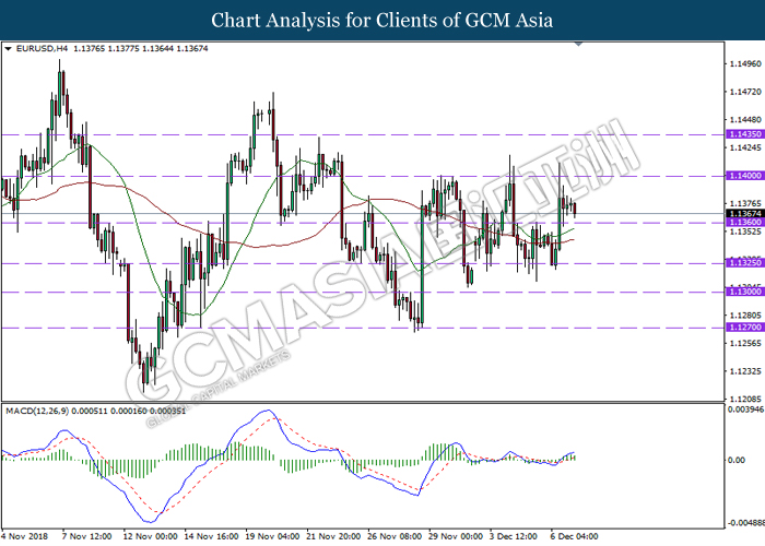 EURUSD, H1: EURUSD was traded higher following prior rebound from the lower level. MACD which illustrate bullish signal suggests the pair to extend its gains, towards the direction of resistance level near 1.1360.