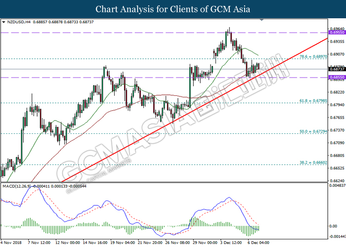 NZDUSD, H4: NZDUSD was traded lower while currently testing near the upward trendline. MACD which illustrates diminishing bearish momentum suggest the pair to rebound from the upward trendline towards the resistance level 0.6900.