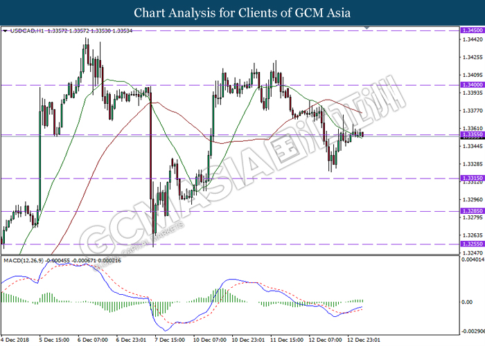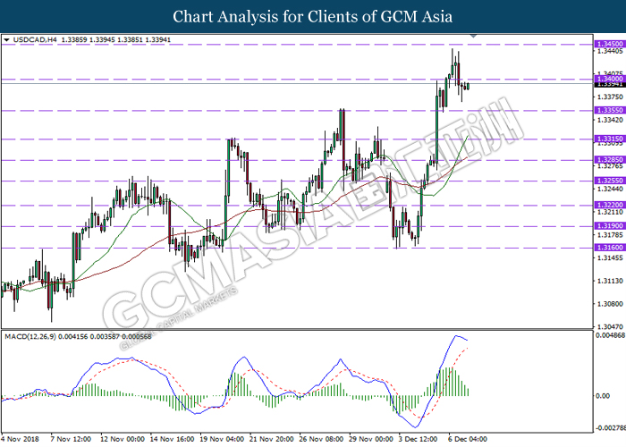 USDCAD, H4: USDCAD was traded lower following prior retracement from the resistance level near 1.3430. MACD which illustrate diminishing upward momentum suggests the pair to be traded lower in short-term as technical correction.