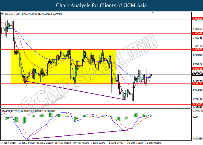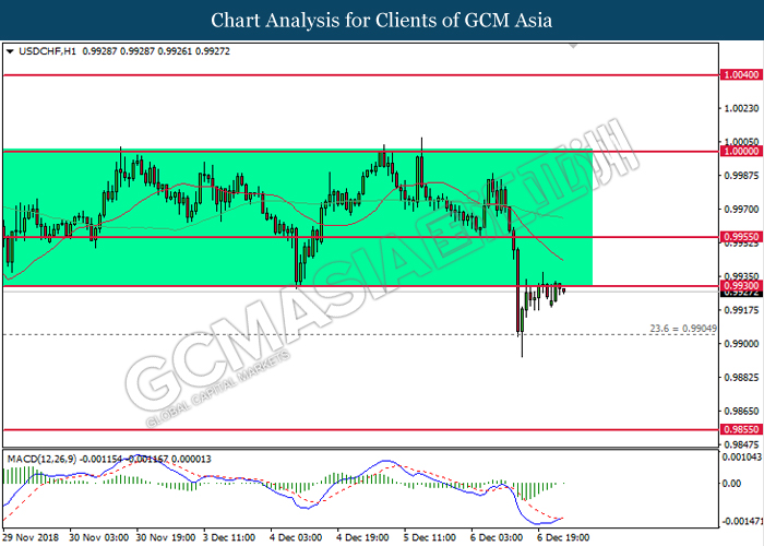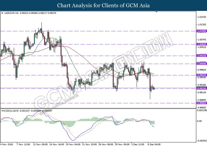 USDCHF, H4: USDCHF was traded lower while currently testing near the support level 0.9925. MACD which illustrate bearish momentum suggest the pair to extend its losses after closing its candle below the support level.