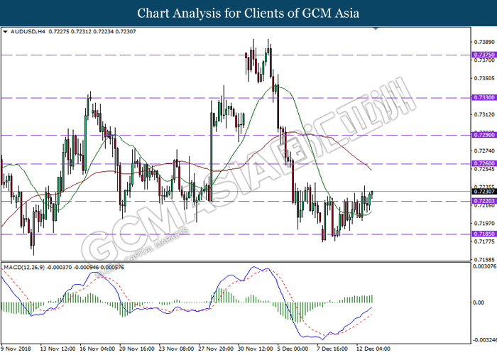 AUDUSD, H4: AUDUSD was traded higher following prior rebound from the support level of 0.7170. MACD which has formed a positive divergence signal suggests the pair to extend its gains in short-term after closing above the 20-MA line (red).