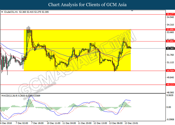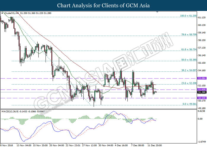 CrudeOIL, H4: Crude oil was traded higher in the sideway channel following prior rebound near the support level at 50.35. Due to lack of clear signal from MACD, it is suggested to wait until further signal appear such as a breakout below or rebound from the support level.