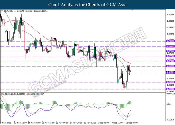 GBPUSD, H1: GBPUSD was traded lower following prior retracement from the higher levels. MACD which illustrate diminishing upward momentum suggests the pair to extend its losses in short-term as technical correction.