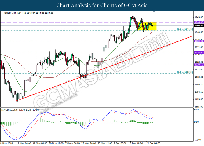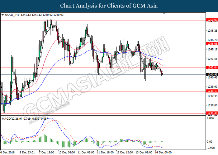 In the commodities market, crude oil surged 0.31% to $51.60 per barrel after U.S drilling activity fell to its lowest level in about two months as US drillers cut four oil rigs in the week to December 14. Besides, gold dipped 0.05% to $1237.60 a troy ounce amid investors shifted their portfolio towards riskier asset such as Euro and Sterling pound.