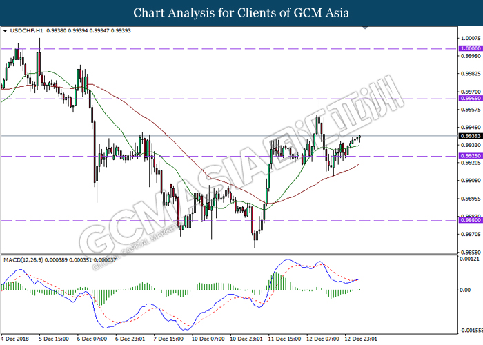 USDCHF, H1: USDCHF was traded higher while currently testing near the resistance level of 0.9930. MACD which begins to form a golden cross signal suggests the pair to extend its gains after closing above 0.9930.