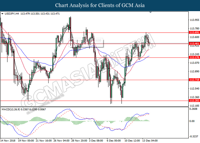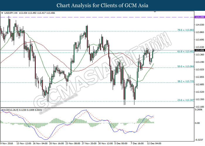USDJPY, H1: USDJPY was traded higher in the sideway channel while currently testing near the resistance level at 113.50. MACD which illustrate bullish momentum and the formation of golden cross suggest the pair to extend its gains after successfully breakout the resistance level at 113.50.
