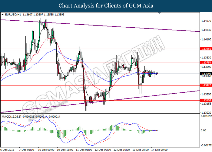 EURUSD, H1: EURUSD was traded lower following prior retracement near 1.1410. MACD which begins to form a death cross signal suggests the pair to be traded lower in short-term as technical correction.
