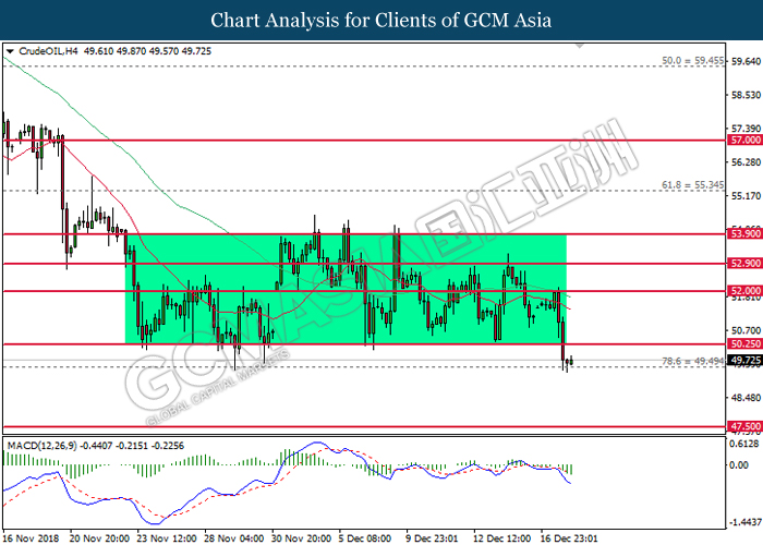 CrudeOIL, H4: Crude oil price was traded lower following prior breakout from the strong support at 50.25. MACD which illustrate bearish signal suggests the commodity price to extend its losses after breaking the support near 49.50.