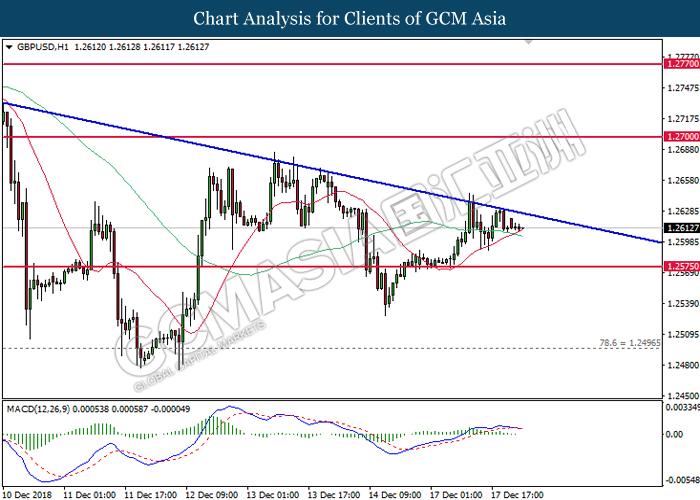 GBPUSD, H1: GBPUSD was traded lower following prior retracement from the downward trendline. MACD which begins to form a death cross signal suggests the pair to be traded lower in short-term after closing below the 20-MA line (red).