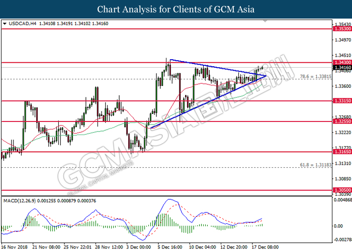 USDCAD, H4: USDCAD was traded higher following prior breakout from the top level of narrowing triangle. MACD which illustrate bullish signal suggests the pair to extend its gains after successfully closing above 1.3430.