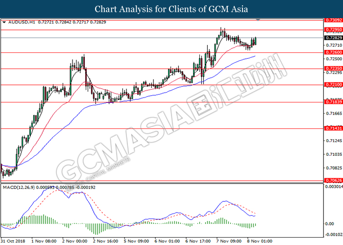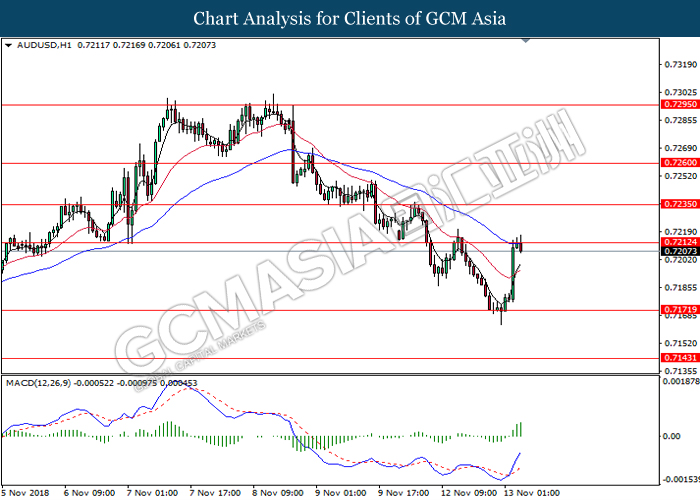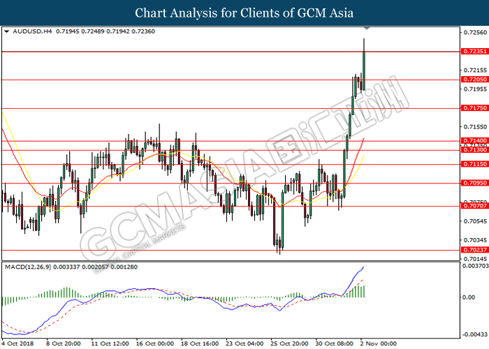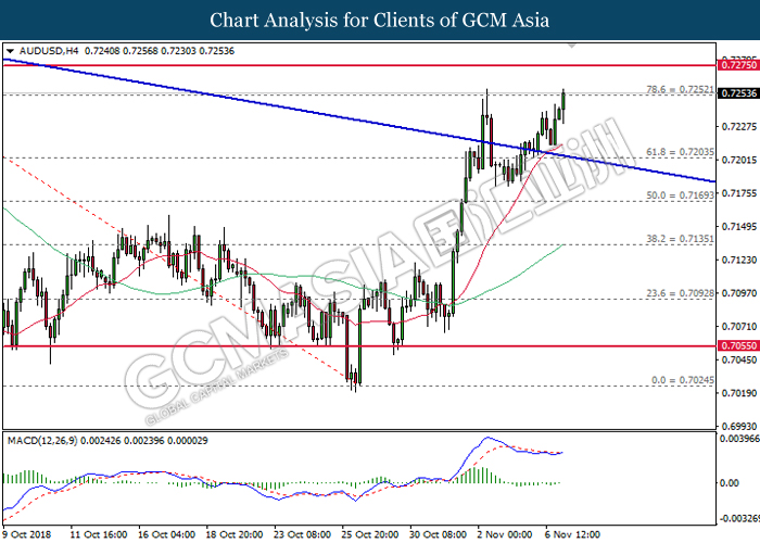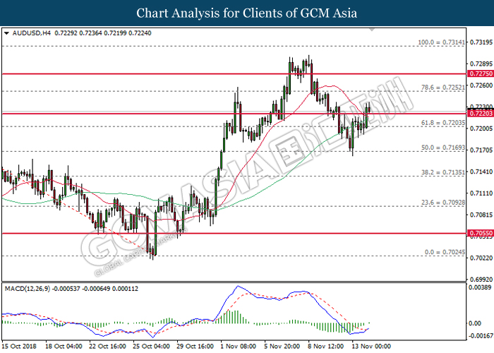 AUDUSD, H4: AUDUSD was trade higher while currently testing near the resistance level at 0.7235. MACD which illustrate bullish momentum and the formation of golden cross suggest the pair to extend its gain after successfully breakout the resistance level at 0.7235.