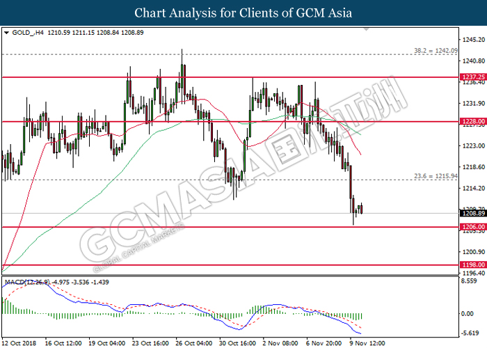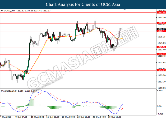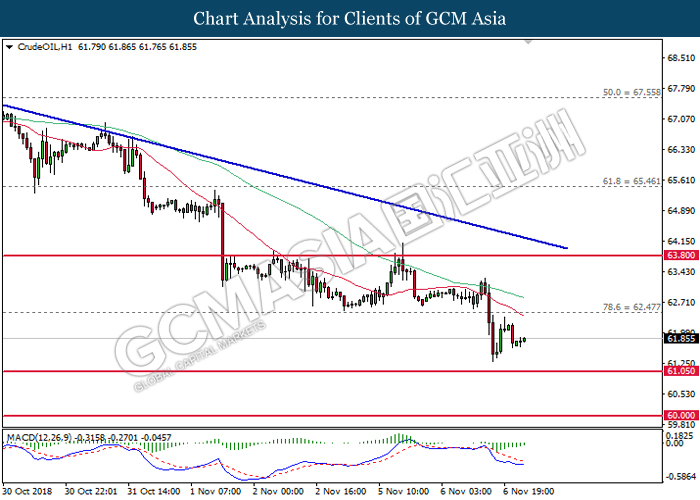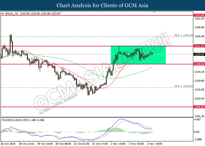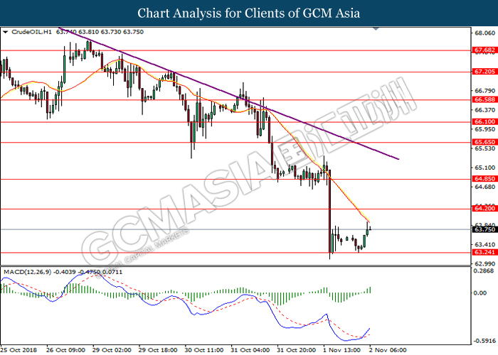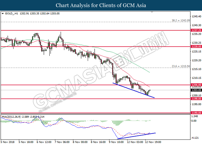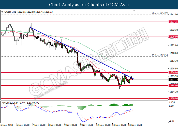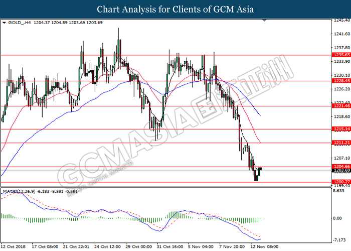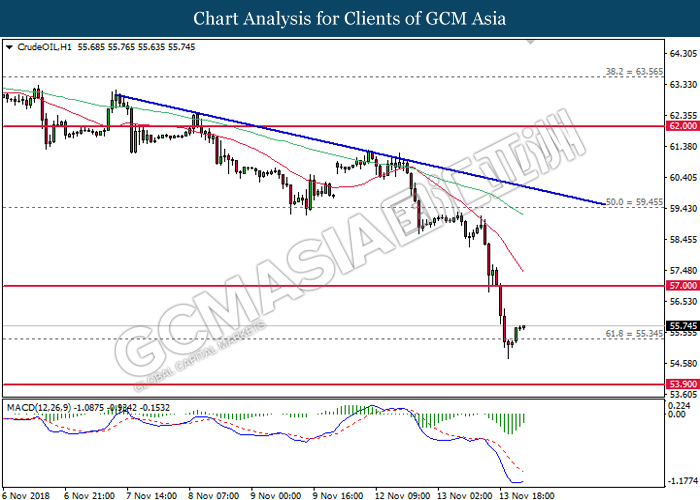 As for commodities market, crude oil price rose 0.89% to $55.72 per barrel as it rebounds from the lower level. On yesterday, the commodity price fell more than 7% after OPEC monthly report shows that the cartel and Russian crude production continues to climb in October, offsetting losses from US lead sanction against Iran. Otherwise, gold price mends its losses by 0.07% to $1,202.92 a troy ounce following weaker dollar.
