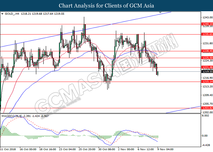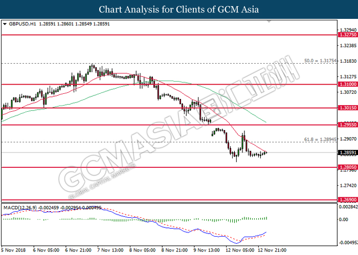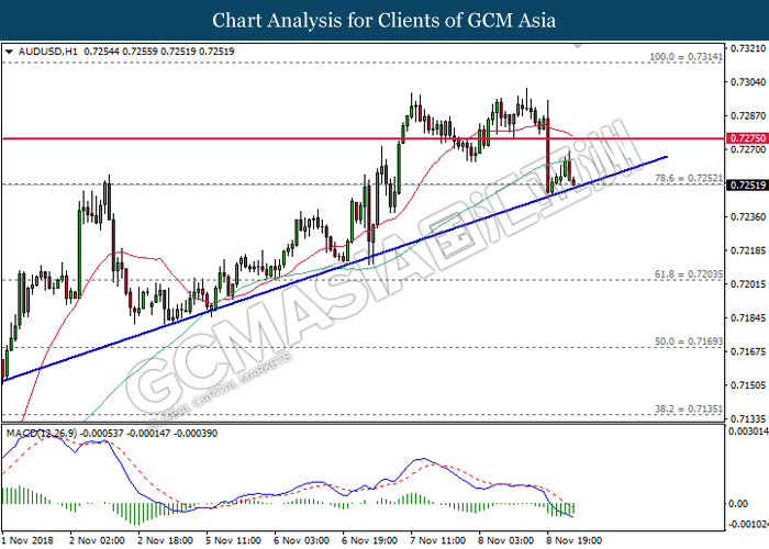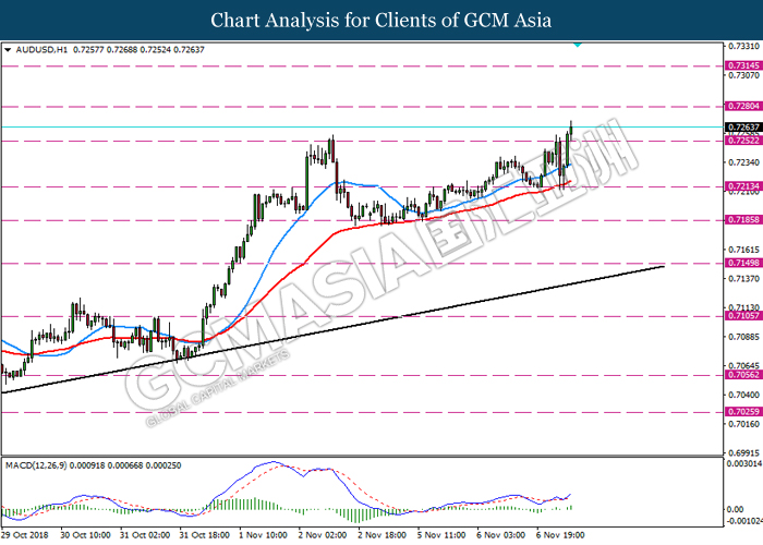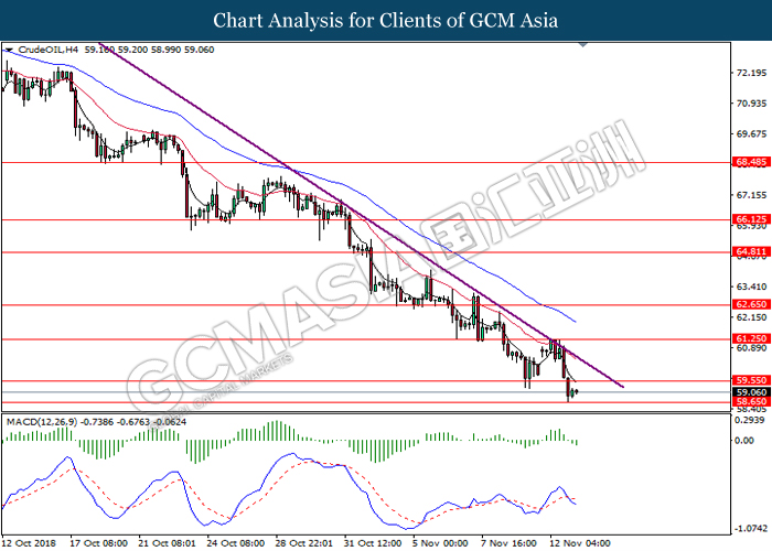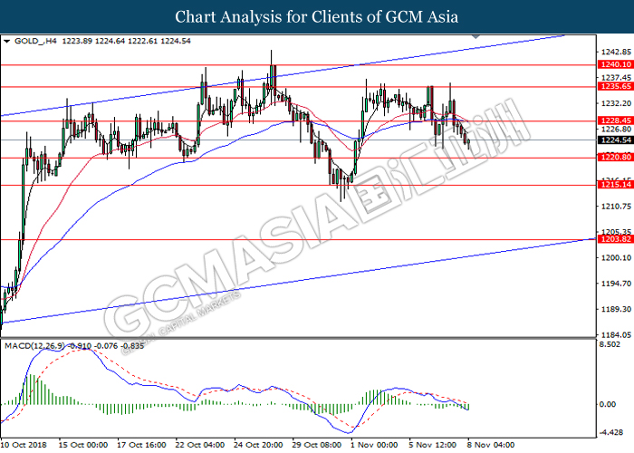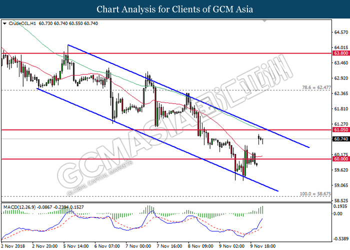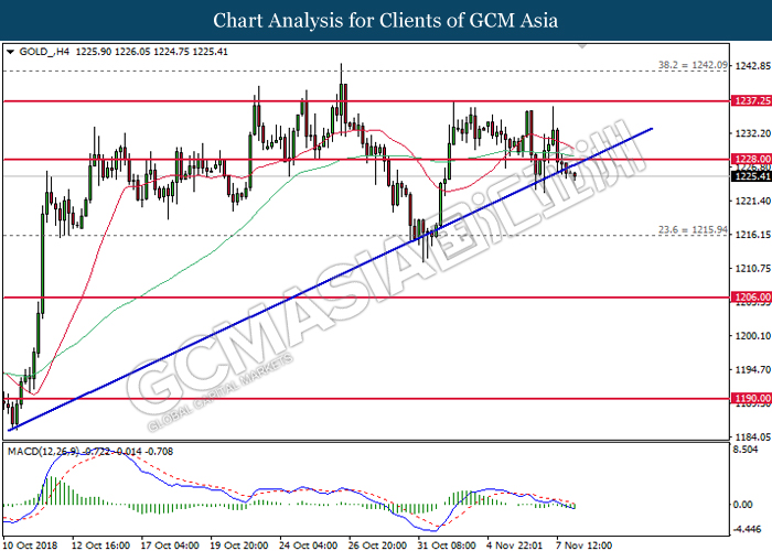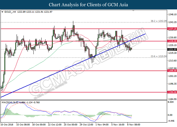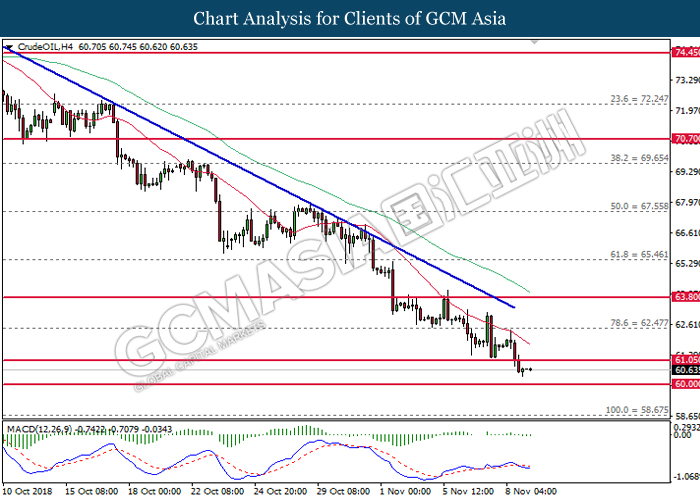 As for commodities market, crude oil price rose 0.89% to $55.72 per barrel as it rebounds from the lower level. On yesterday, the commodity price fell more than 7% after OPEC monthly report shows that the cartel and Russian crude production continues to climb in October, offsetting losses from US lead sanction against Iran. Otherwise, gold price mends its losses by 0.07% to $1,202.92 a troy ounce following weaker dollar.