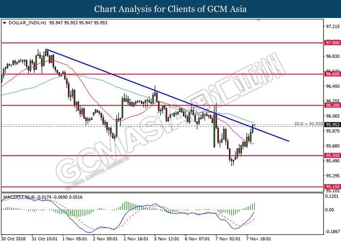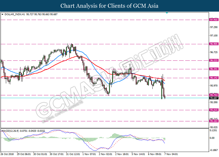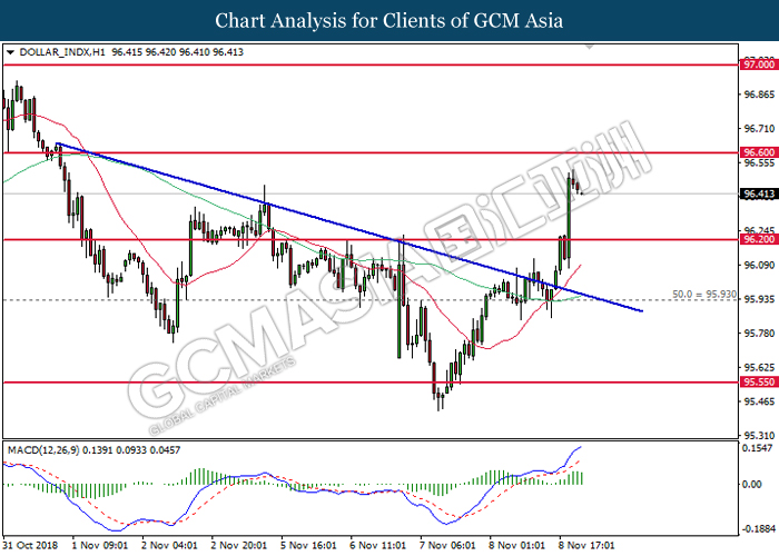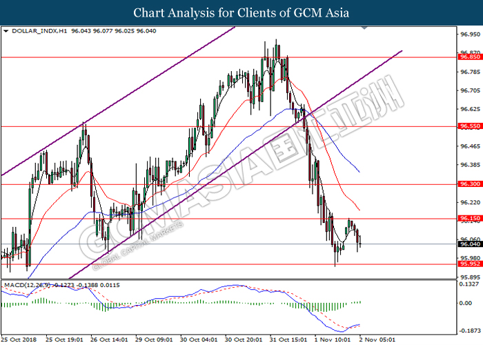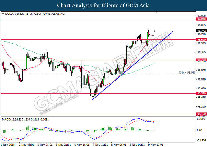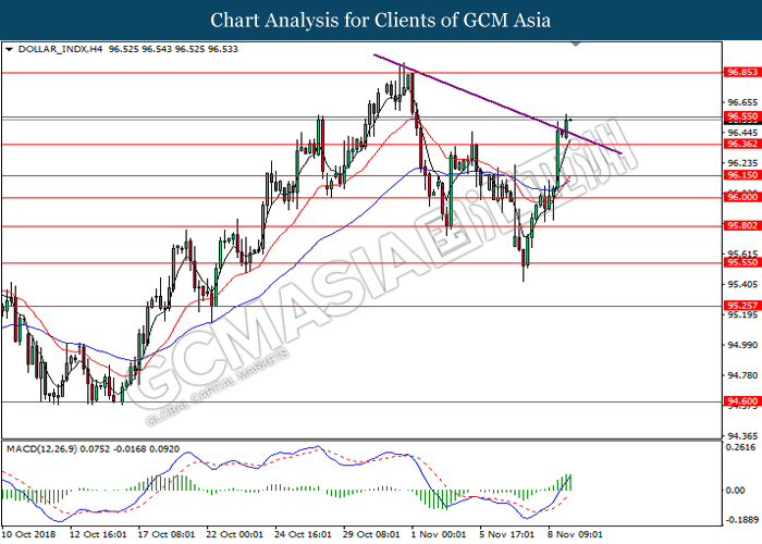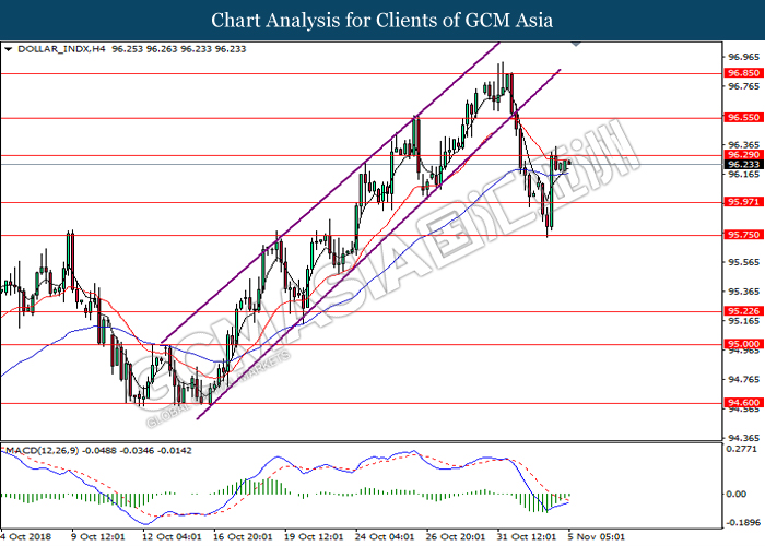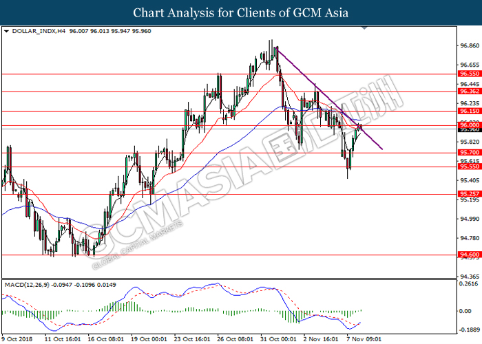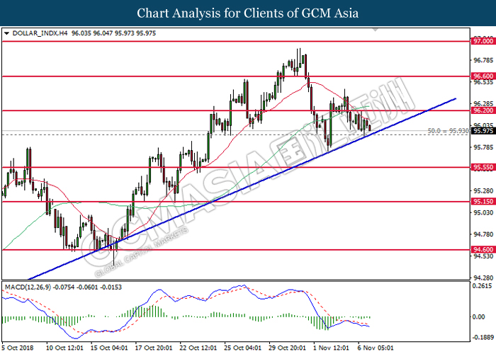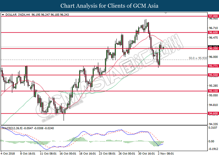 DOLLAR_INDX, H4: Dollar index was traded higher while currently testing near the support level of 96.20. MACD which illustrate diminishing downward momentum suggests the index to extend its gains after a successful rebound from the support of 96.20.