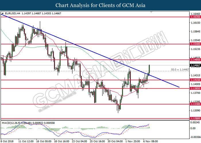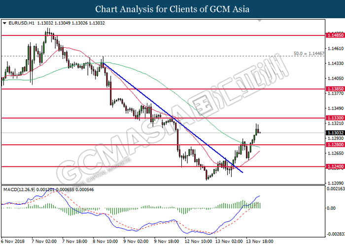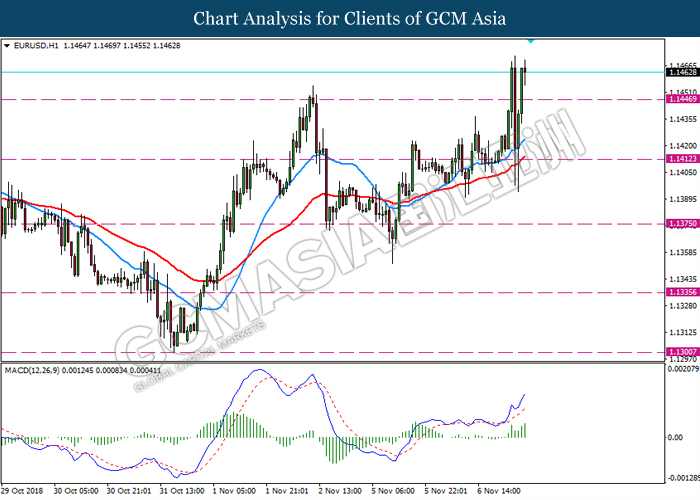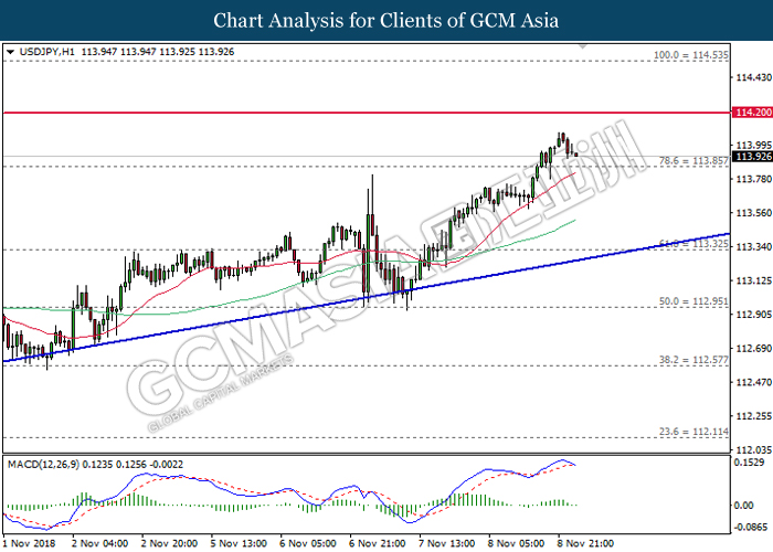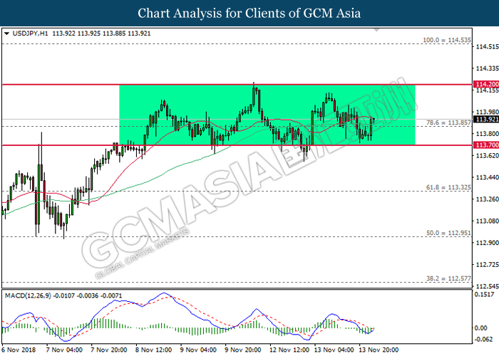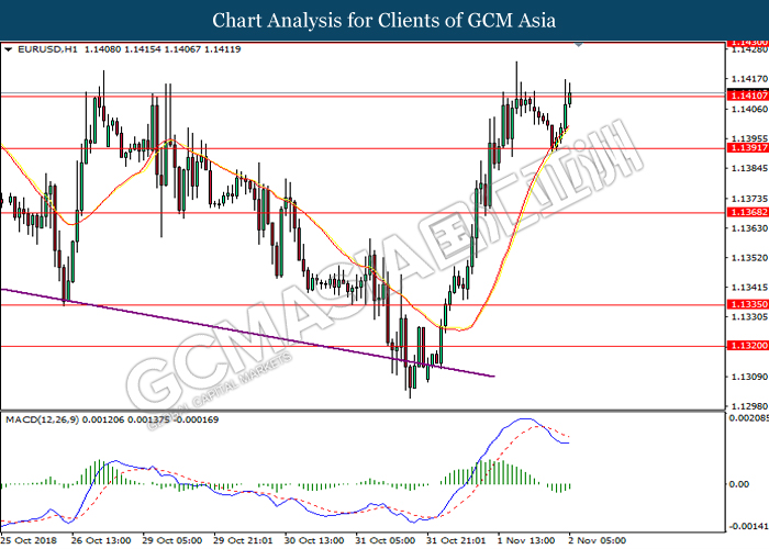 EURUSD, H1: EURUSD was traded higher while currently testing near the resistance level at 1.1410. MACD which illustrate diminishing of bearish momentum suggest the pair to extend its gain after successfully breakout the resistance level at 1.1410.