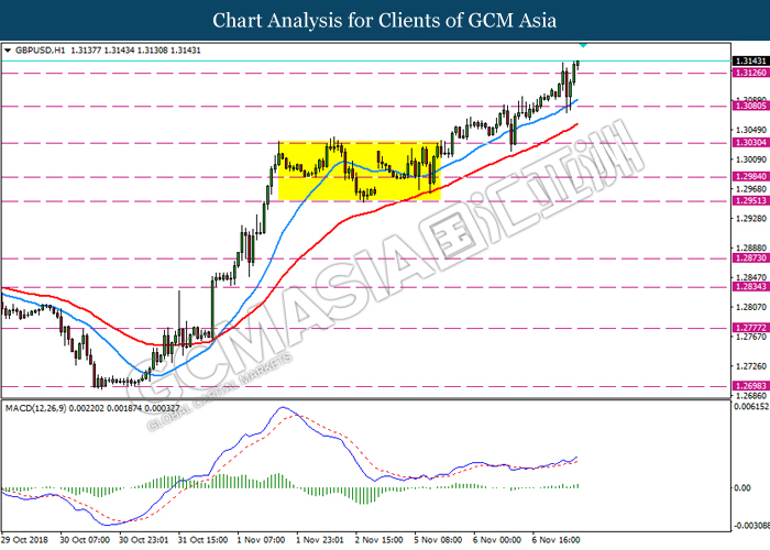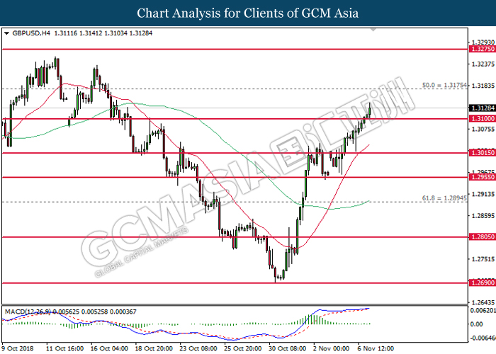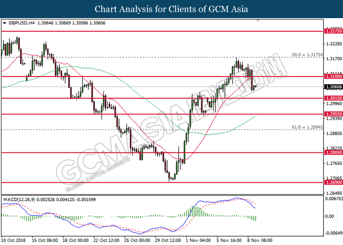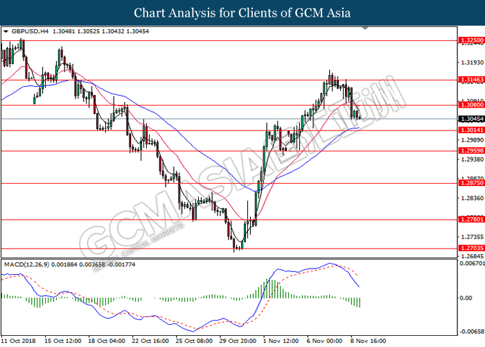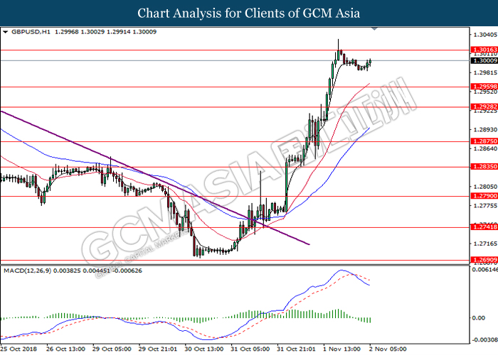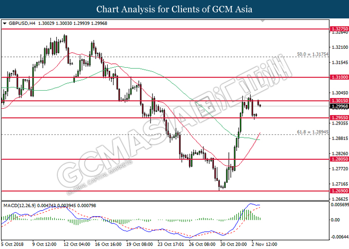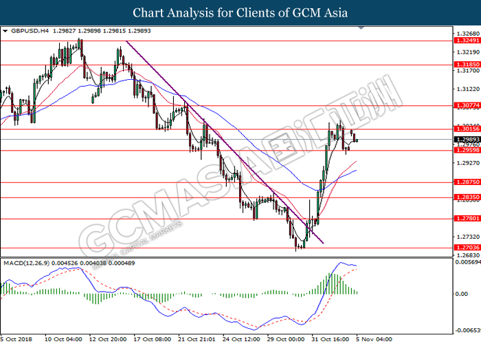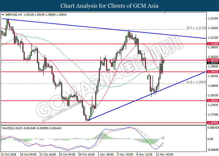 GBPUSD, H4: GBPUSD remains traded within a narrowing triangle while currently testing at the target of 1.3015. MACD which illustrate bullish signal suggests the pair to extend its gains after breaking the target.