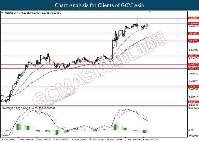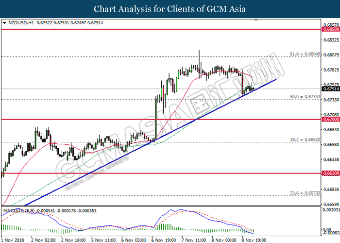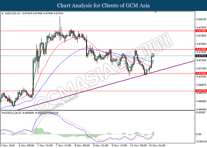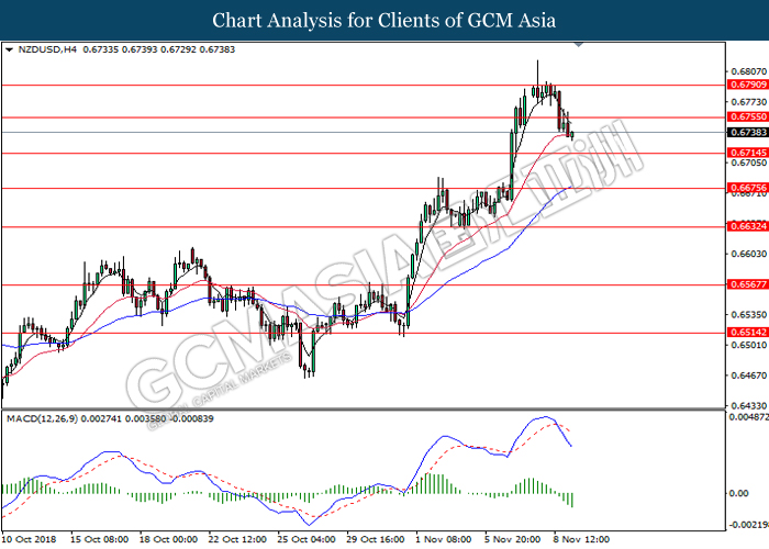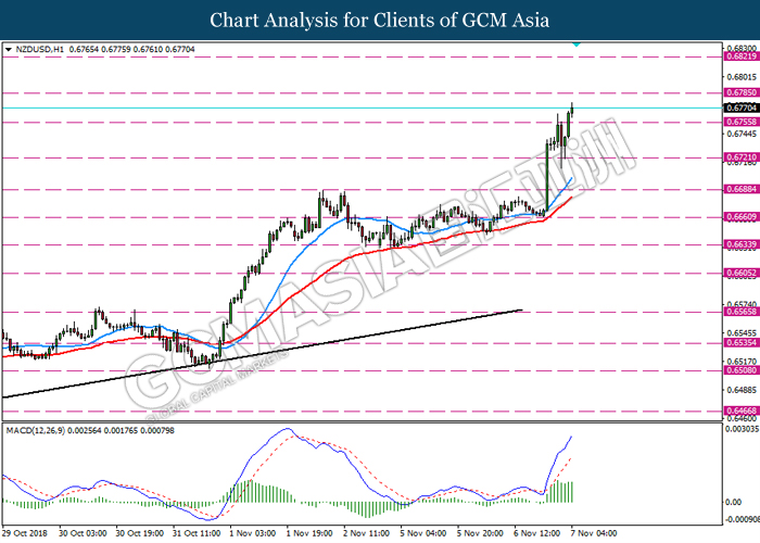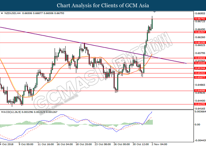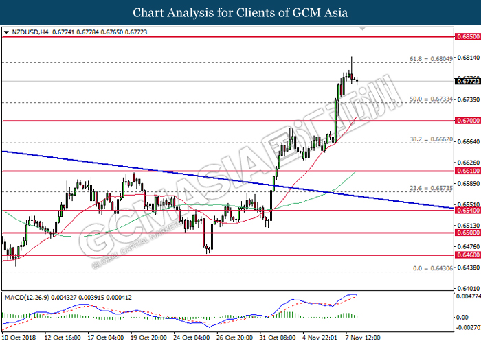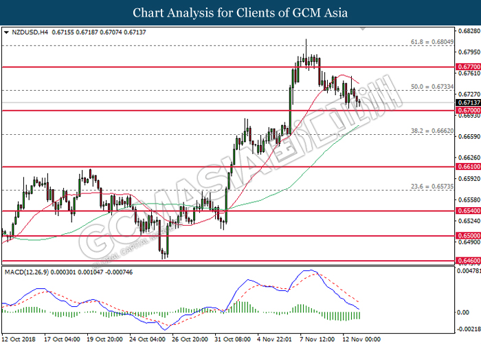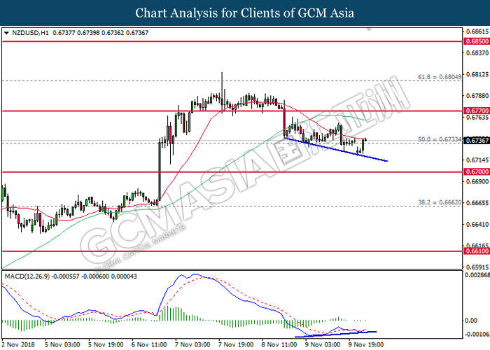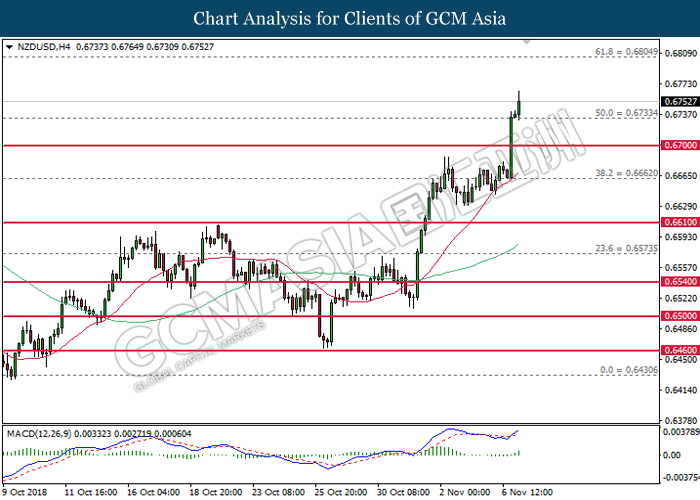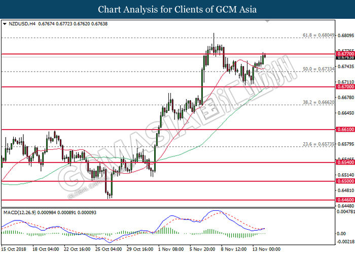 NZDUSD, H4: NZDUSD was traded higher following prior rebound from the lower levels. MACD which begins to form a golden cross signal suggests the pair to extend its gains after breaking the resistance level at 0.6770.