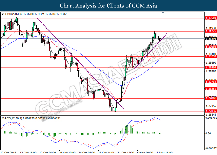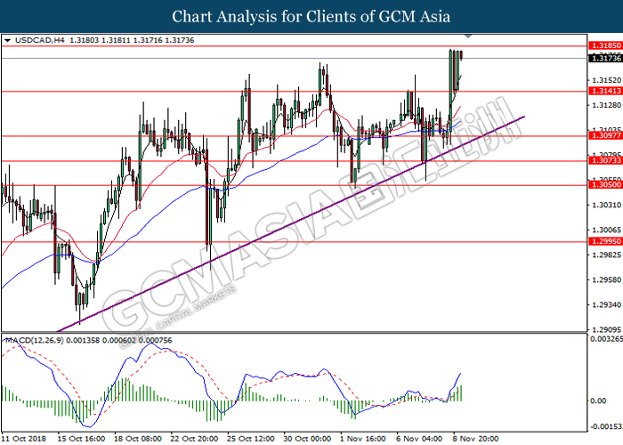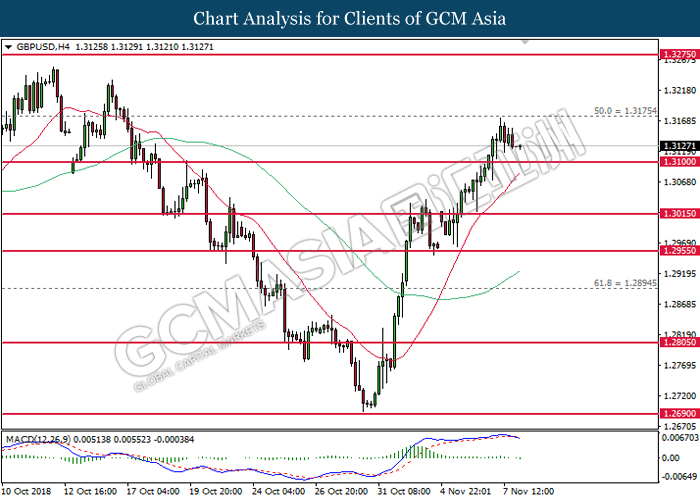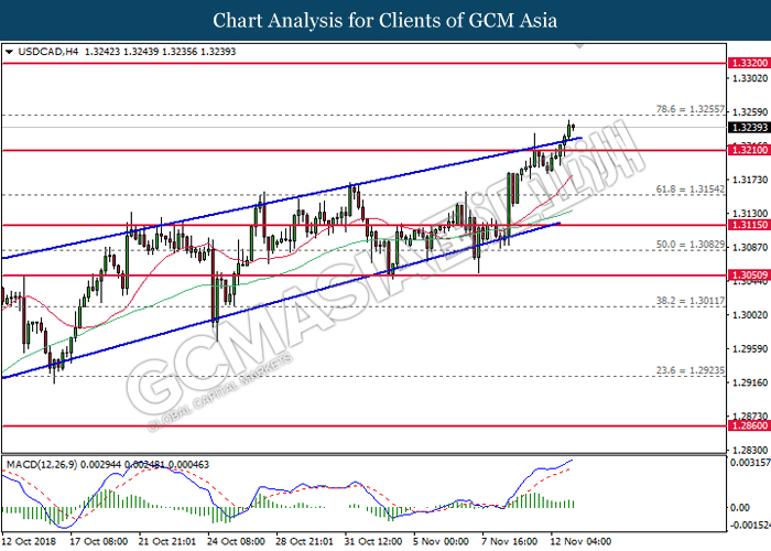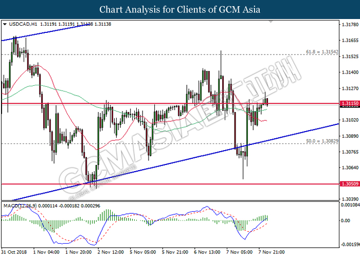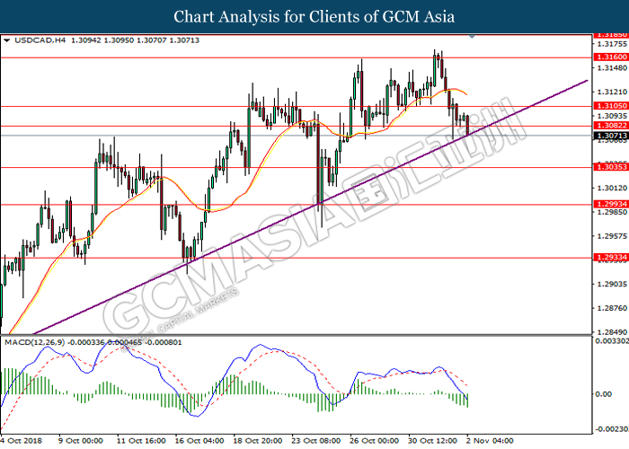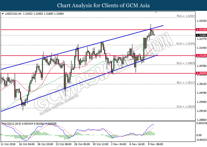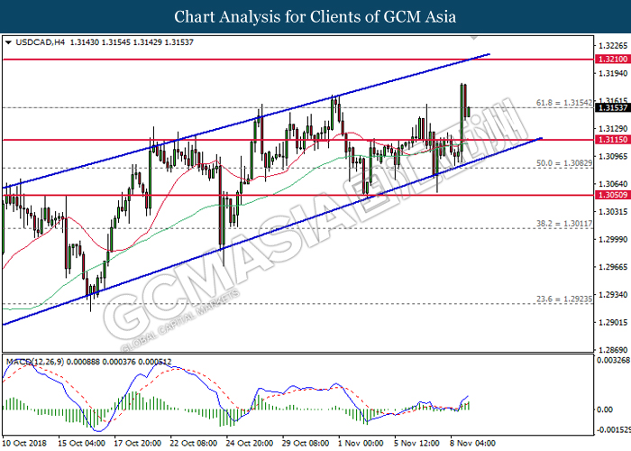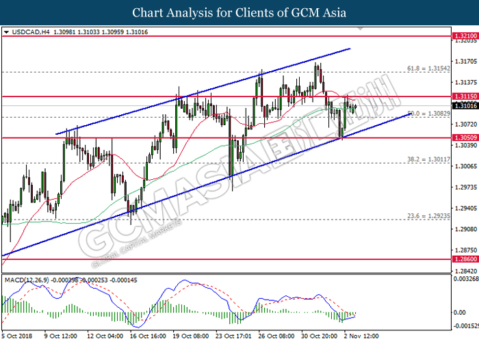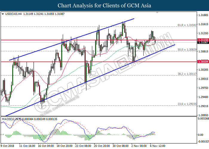 USDCAD, H4: USDCAD remains traded within an ascending channel following prior rebound from the lower level. MACD which illustrate diminishing downward momentum suggests the pair to extend its gains after closing above the threshold at 1.3115.