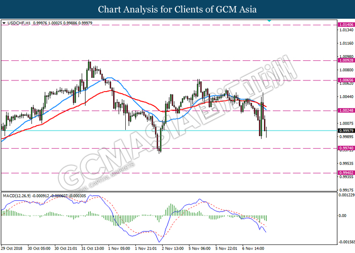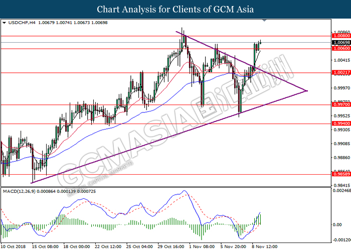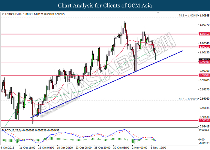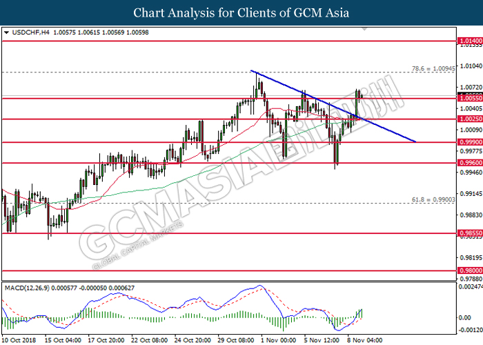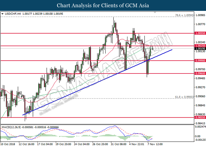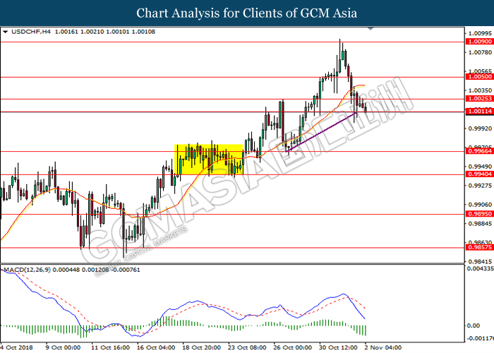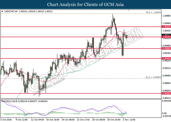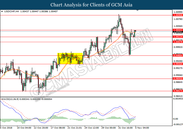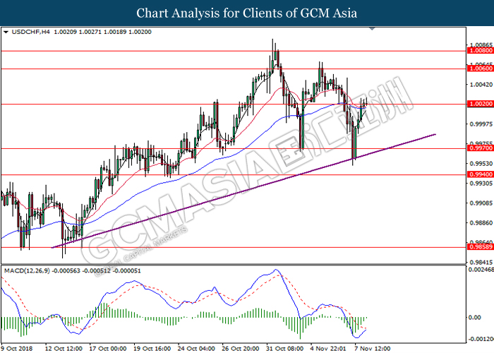 USDCHF, H4: USDCHF was traded higher while currently testing near the support level of 1.0025. MACD which illustrate diminishing downward momentum suggests the pair to extend its gains after a successful rebound from 1.0025.