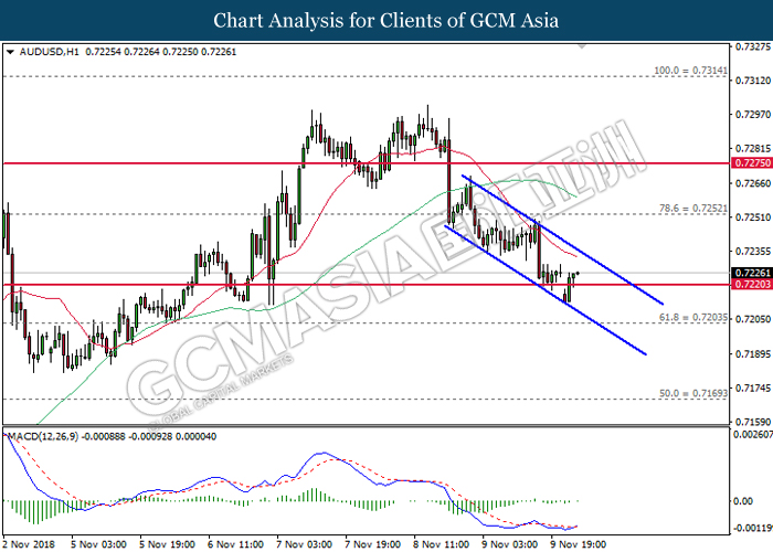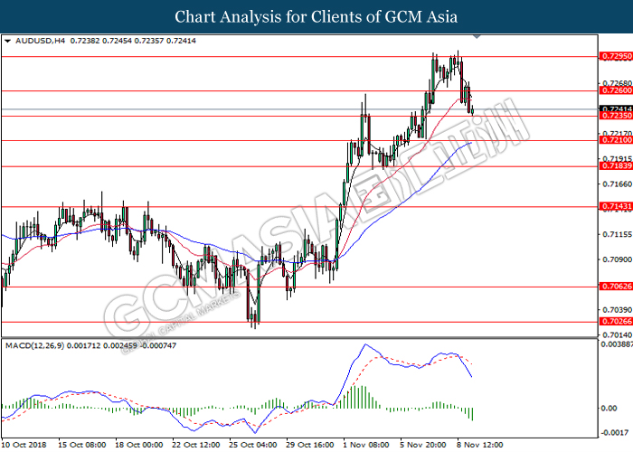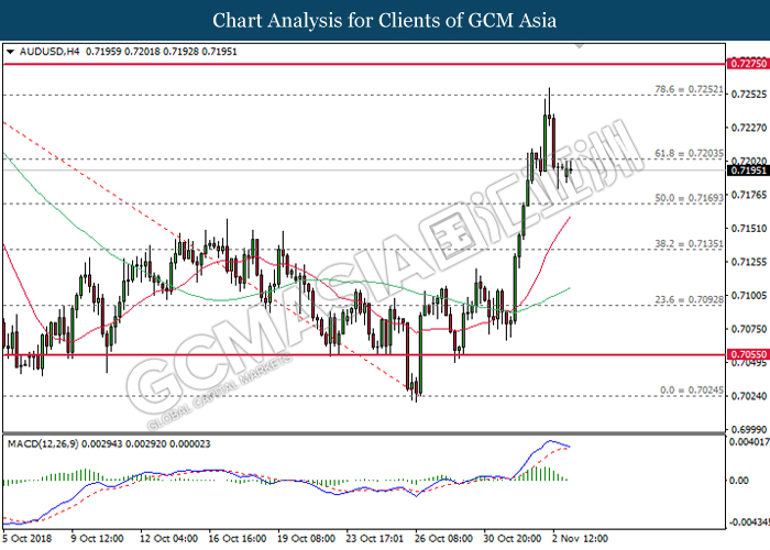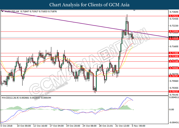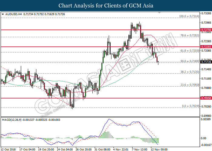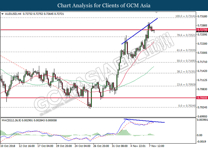 AUDUSD, H4: AUDUSD was traded lower following prior retracement from the resistance at 0.7250. MACD which begins to form a death cross signal suggests the pair to be traded lower in short-term, towards the direction of 0.7170.