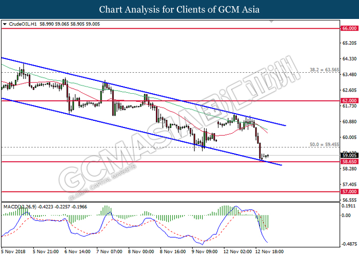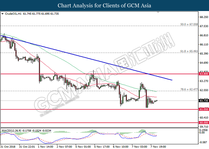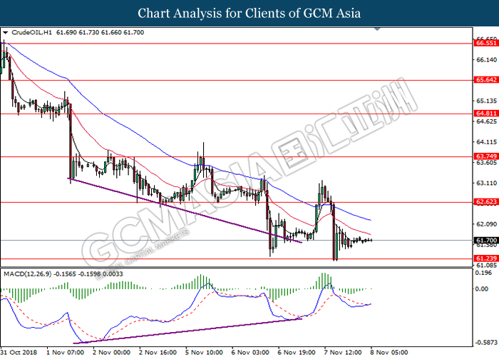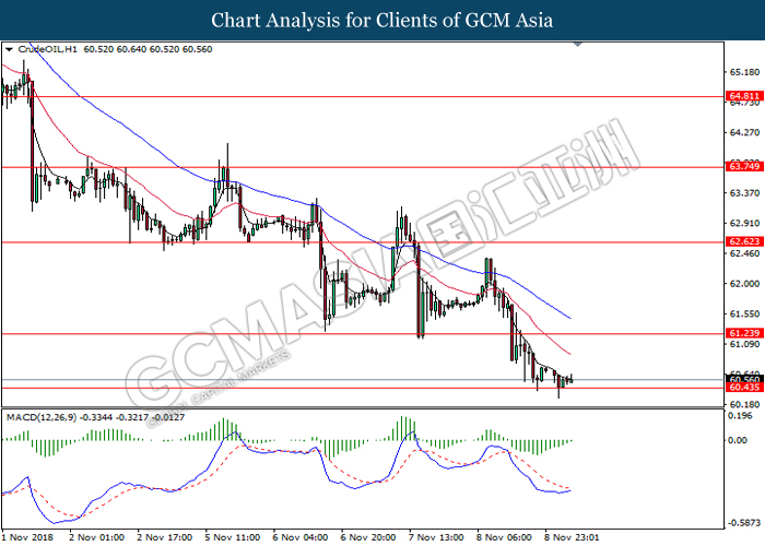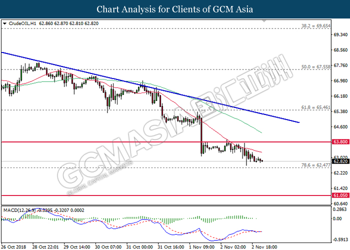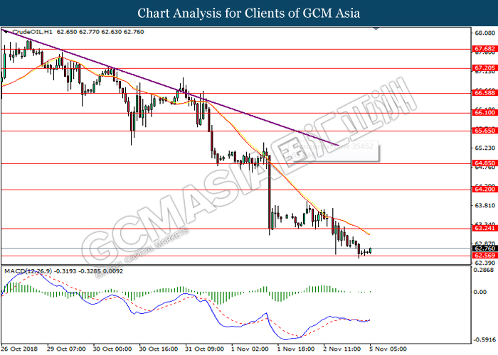 CrudeOIL, H1: Crude oil price remains traded within a downtrend following prior retracement from the 20-MA line (red). MACD which begins to form a death cross signal suggests the commodity price to extend its losses after breaking the support level at 62.50.