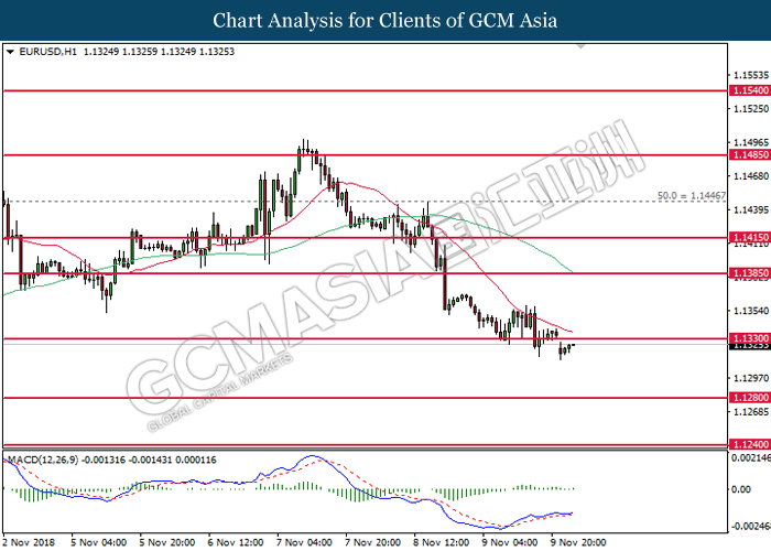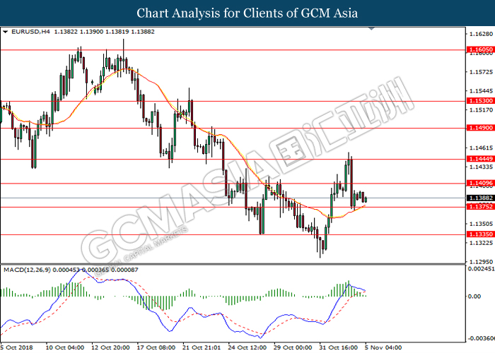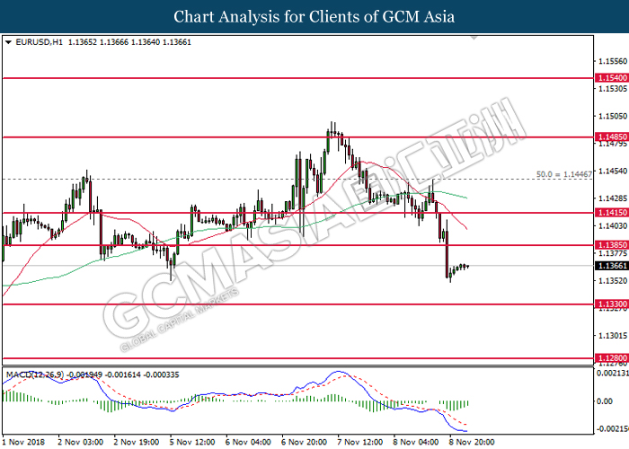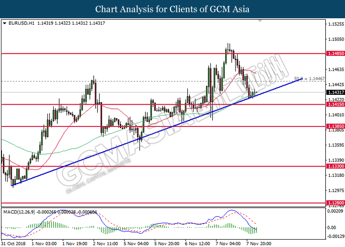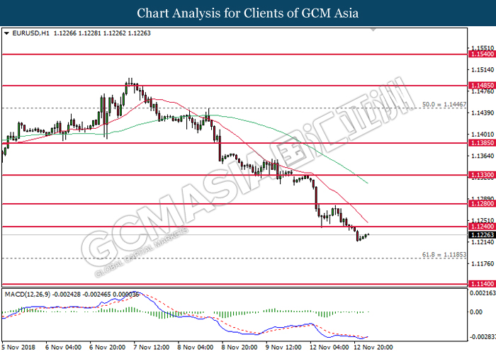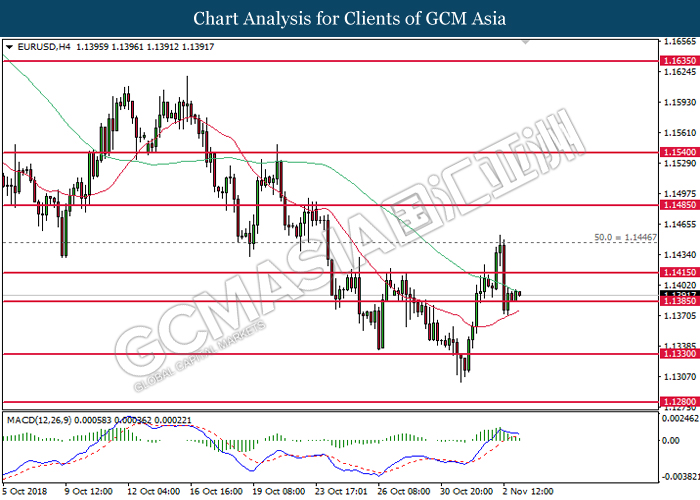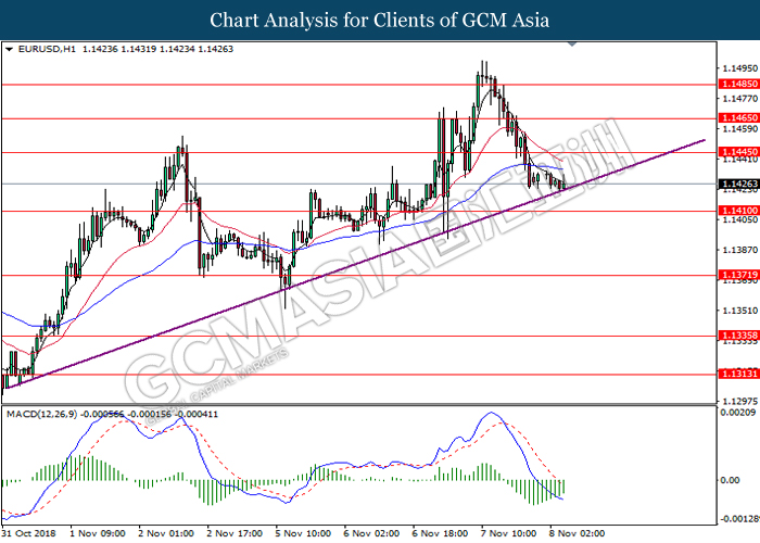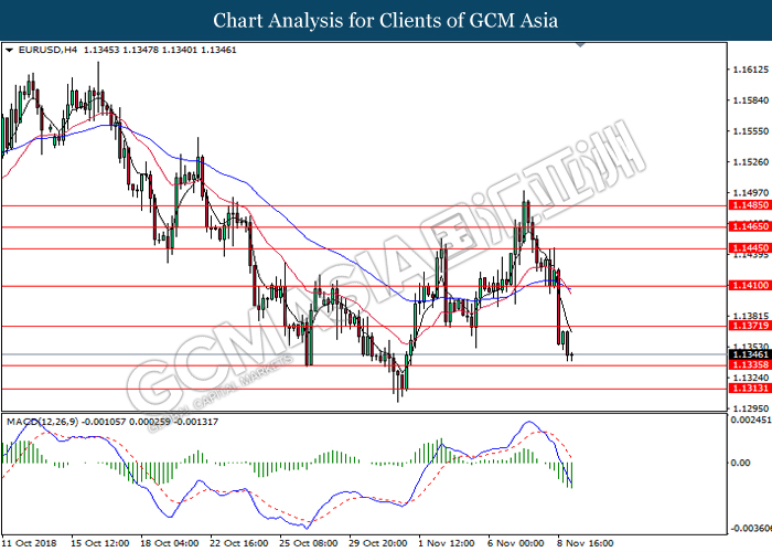 EURUSD, H4: EURUSD was traded lower following prior retracement from 1.1445. MACD which illustrate diminishing upward momentum suggests the pair to extend its losses after closing below the support at 1.1385.