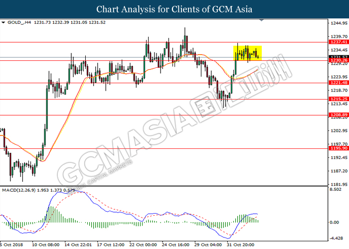 GOLD_, H4: Gold was traded in sideway channel following prior breakout from the previous resistance level at 1230.25. MACD which illustrate diminishing bullish momentum suggest the commodity to extend its losses after successfully breakout the support level at 1230.25.