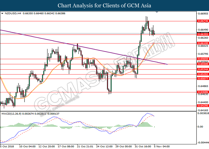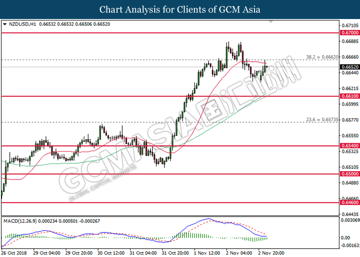 NZDUSD, H1: NZDUSD was traded higher while currently testing near the resistance level of 0.6660. MACD which illustrate diminishing downward momentum may suggests the pair to be traded higher in short-term as technical correction.