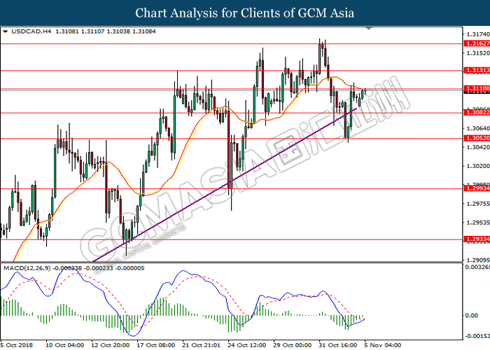USDCAD, H4: USDCAD was traded higher while currently testing near the resistance level at 1.3110. MACD which illustrate diminishing bearish momentum and the formation of golden cross suggest the pair to extend its gains after successfully breakout the resistance level at 1.3110.