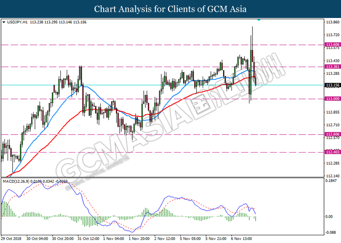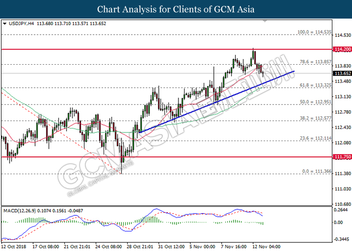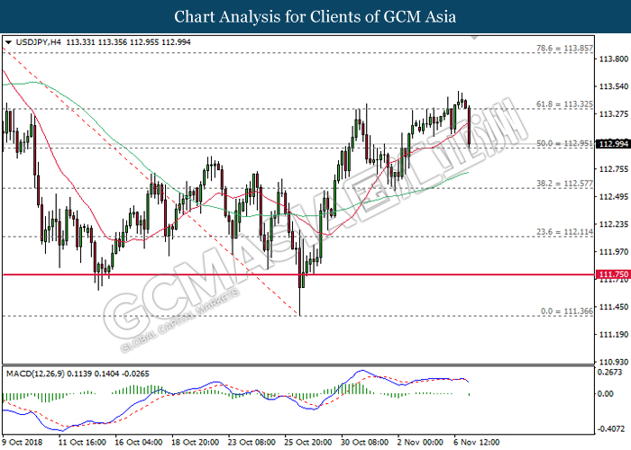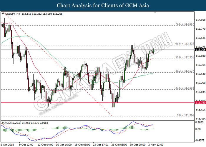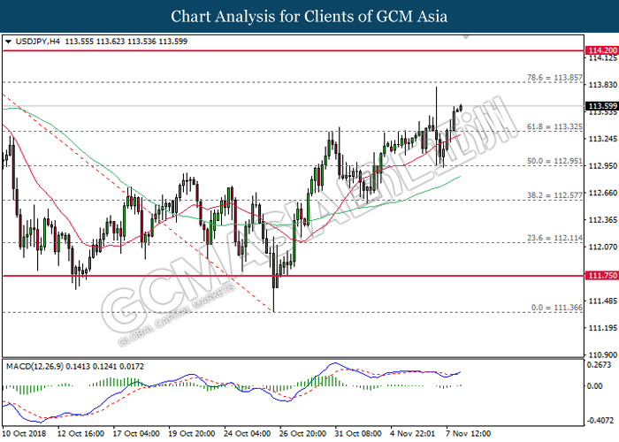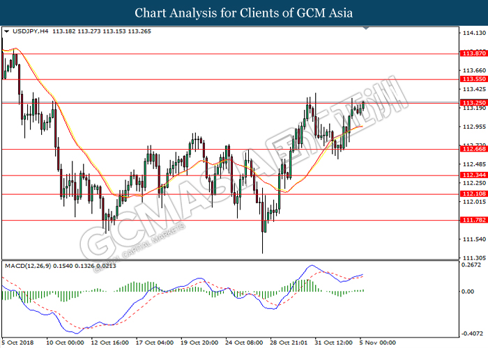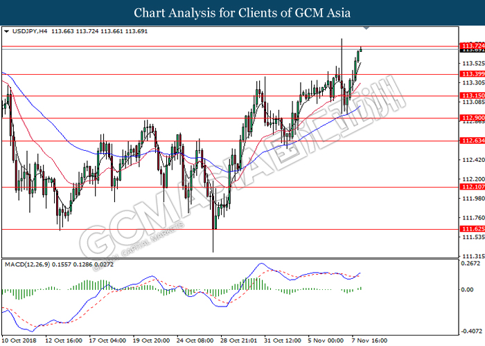 USDJPY, H4: USDJPY was traded higher following prior rebound from the support level at 112.60. MACD which begins to form a golden cross signal suggests the pair to extend its gains after closing above the target of 113.30.