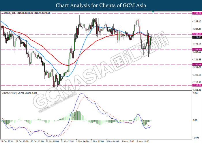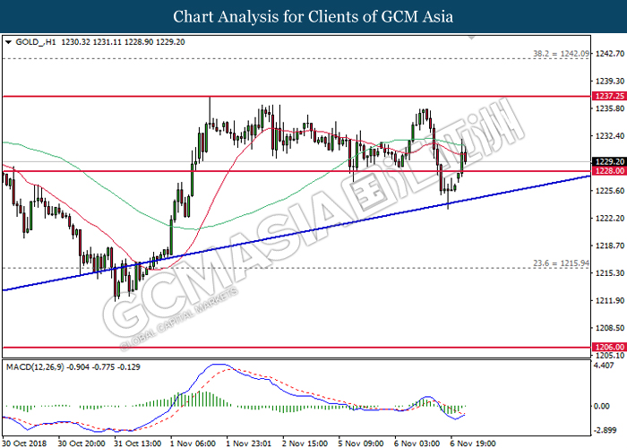 GOLD_, H1: Gold price was traded flat and currently testing near the downward trendline. MACD which illustrate bullish signal suggests its price to extend its gains after a breakout occur at the trendline.