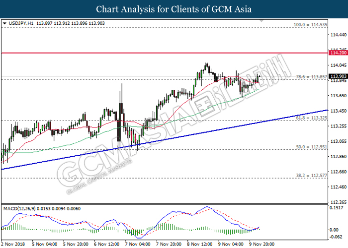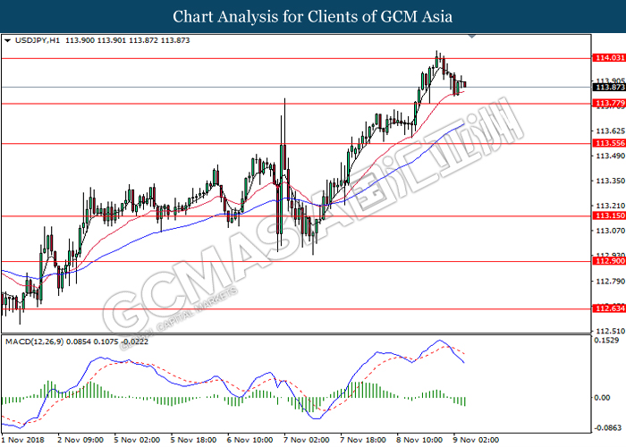 USDJPY, H1: USDJPY was traded higher following prior rebound from the support level at 113.65. MACD which illustrate bullish momentum and the formation of golden cross suggest the pair to extend its gains toward the resistance level at 114.05.