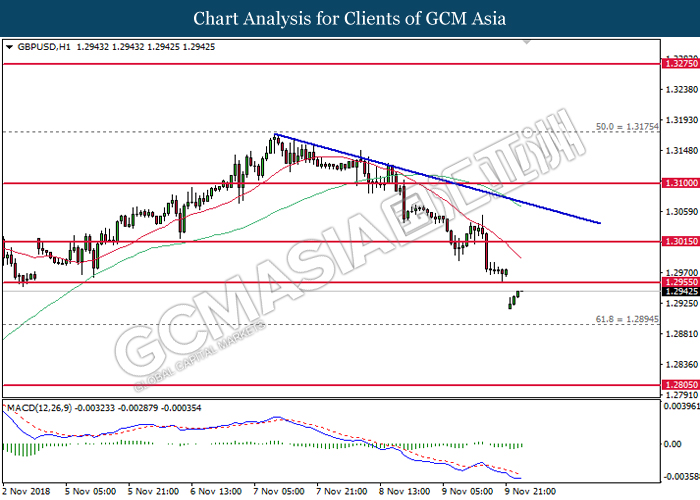 GBPUSD, H1: GBPUSD was traded lower following prior retracement from the resistance level at 1.3015. MACD which illustrate bearish momentum and the formation of death cross suggest the pair to extend its losses toward the support level at 1.2960.