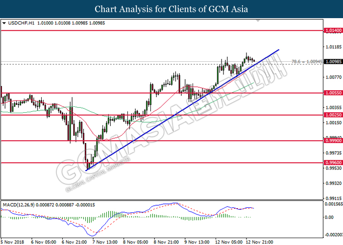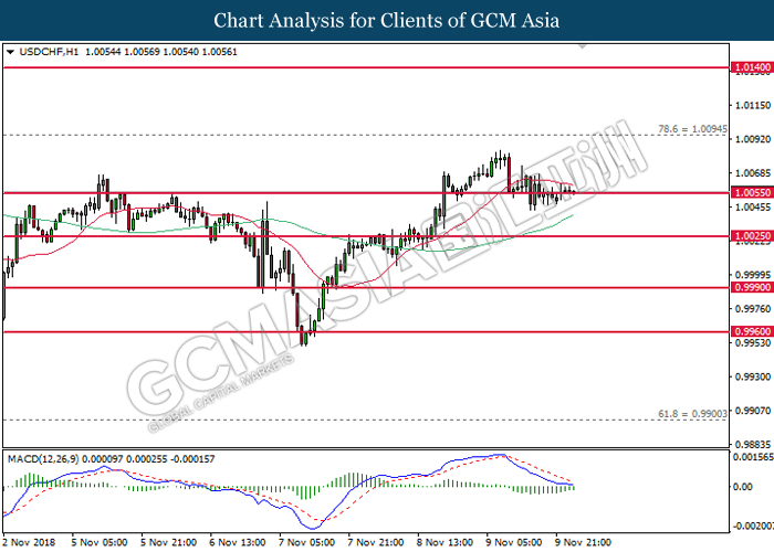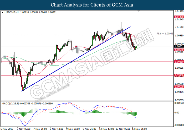USDCHF, H1: USDCHF was traded higher following prior rebound from the support level of 1.0055. MACD which illustrate diminishing downward momentum suggests the pair to be traded higher in short-term as technical correction.