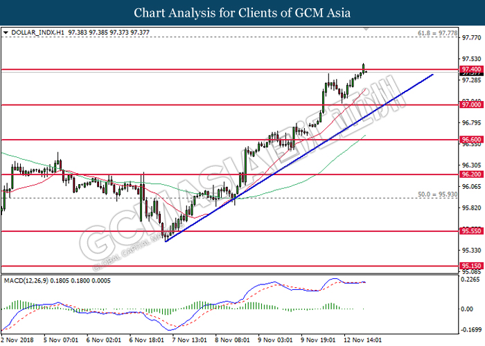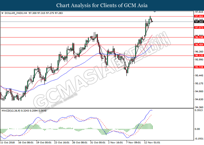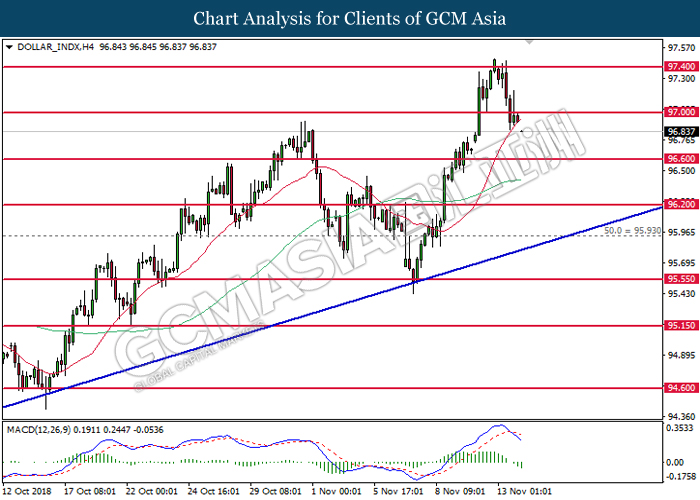 Greenback retraced from its prior high on Tuesday following a surge in pound sterling after EU and Britain agreed to a draft of Brexit withdrawal agreement. UK Prime Minister is expected to hold a Cabinet meeting today to present the drafted Brexit agreement among her senior ministers. In addition, a summit with the EU could occur as soon as November 25th, signaling for the end of Brexit risks which lingers upon Britain for the past two years. However, skepticism still lingers among investors as it may face a stiff challenge in the Cabinet. May does not have a majority in the parliament and she faces opposition from Labor Party as well as from within her Conservative Party. On the other hand, US dollar was met with cynicism among market participants after economists warned that the gap between US interest rates and the rest of the world will likely narrow starting next year. As such, investors may turn their attention towards other assets which may follow Federal Reserve’s part in tightening their monetary policy amid rising inflationary pressure. As of writing, US dollar was down 0.59% to 96.93 while pair of GBP/USD was up 0.34% to 1.3022.