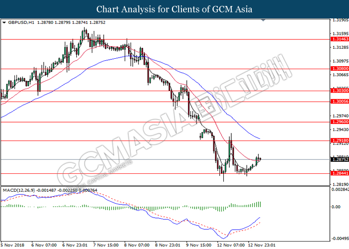 GBPUSD, H1: GBPUSD was traded higher following prior rebound from the support level at 1.2845. MACD which illustrate bullish momentum suggest the pair to extend its gains toward the resistance level at 1.2920.