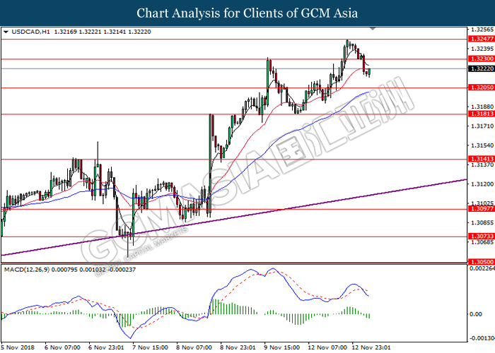 USDCAD, H1: USDCAD was traded lower following prior breakout from the previous support level at 1.3230. MACD which illustrate bearish momentum and the formation of death cross suggest the pair to extend its losses toward the support level at 1.3205.