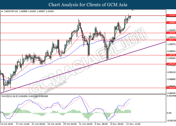 USDCHF, H4: USDCHF was traded higher while currently testing near the resistance level at 1.0105. MACD which illustrate diminishing bullish momentum suggest the pair to be traded lower in short term toward the support level at 1.0080.